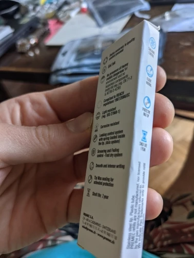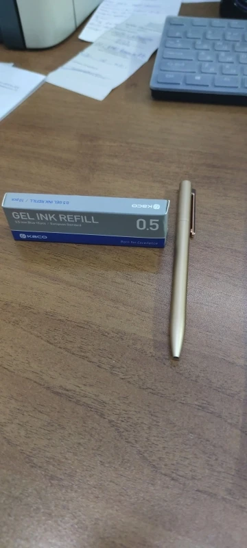 Ручка доехала за 12 дней, коробка немного была помята. Сама ручка отличная, это вторая ручка этого бренда, белая немного легче золотой, в комплекте стержни Premec, в самой ручке тоже. Есть стержни Mija (были вместе с белой), но Premec понравились больше