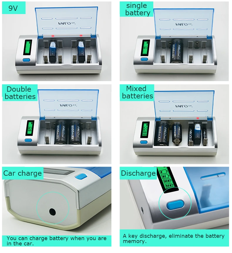 PALO Новейшее интеллектуальное зарядное устройство для аккумуляторов ЖК-дисплей 1,2 В Ni-MH AA AAA C Размер D 9 В Многоцелевое использование 4 слота Зарядное устройство для аккумуляторов Тип C Быстрая разрядка