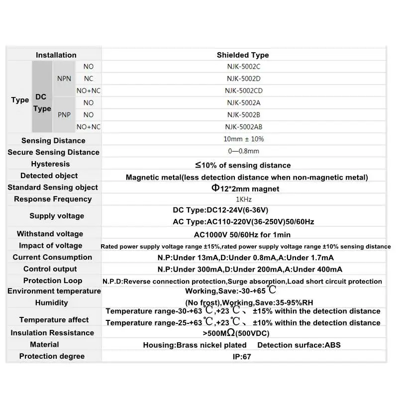 Датчик приближения NJK-5002C/D/A/B M12 NPN NO 3 провода с магнитом 10 ммВыход:NJK-5002C:NPN нормальный открытыйNJK-5002D: нормальное закрытие NPNNJK-5002A:PNP нормальный открытыйNJK-5002B: нормальное закрытие PNPРабочее напряжение: DC6-36VДиаметр: 12 ммРасстояние обнаружения: 10 мм ± 10%Размеры: M12 * 25 ммКаждая ставка за 1 шт.