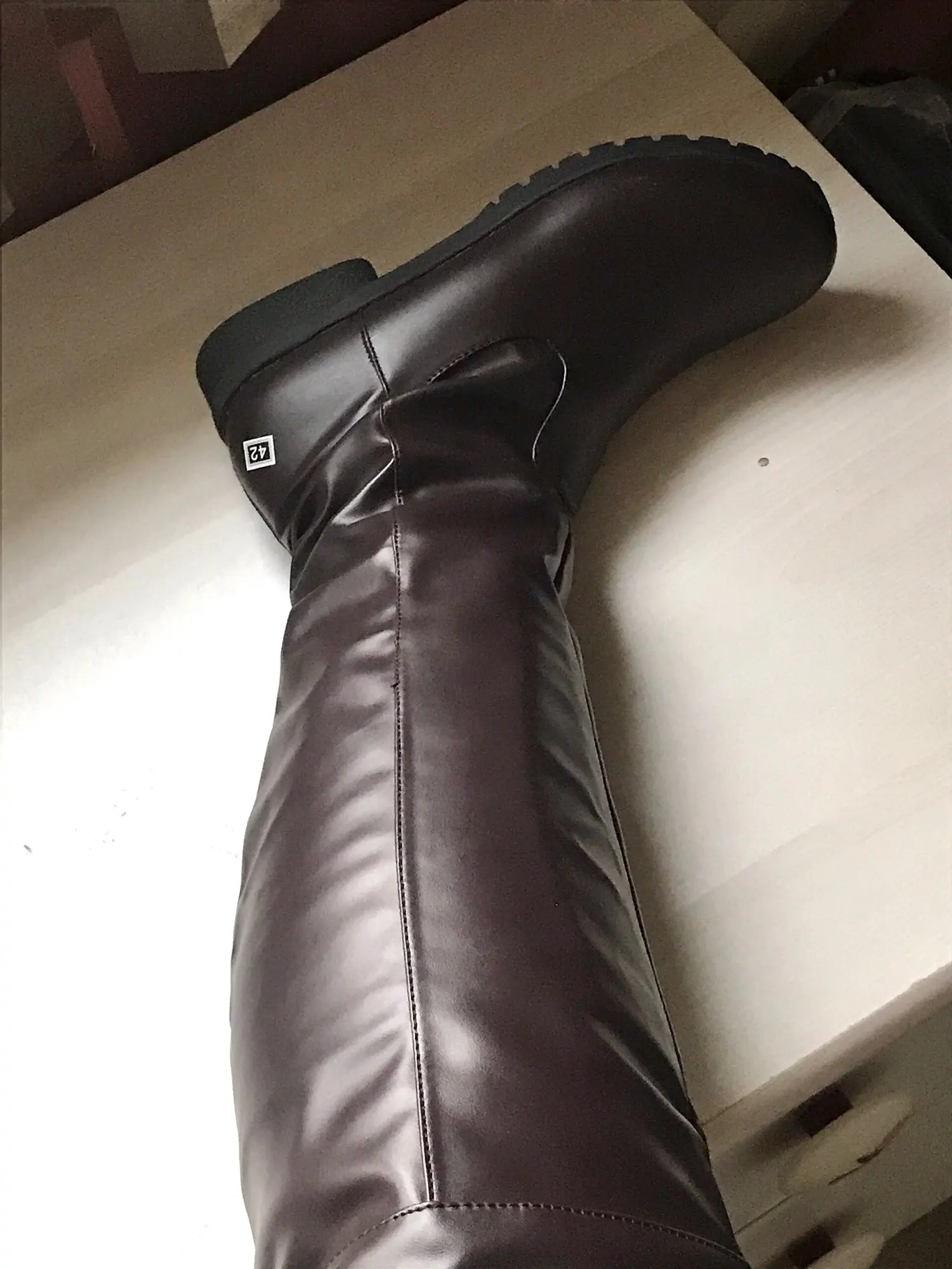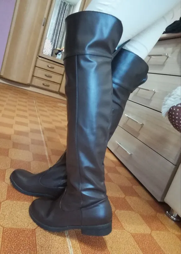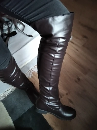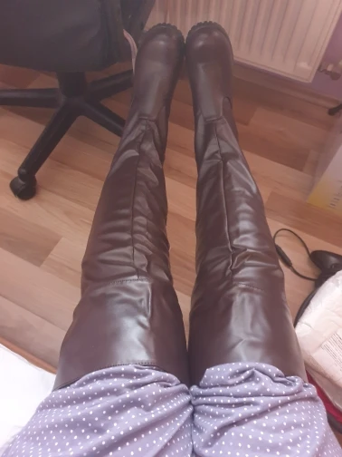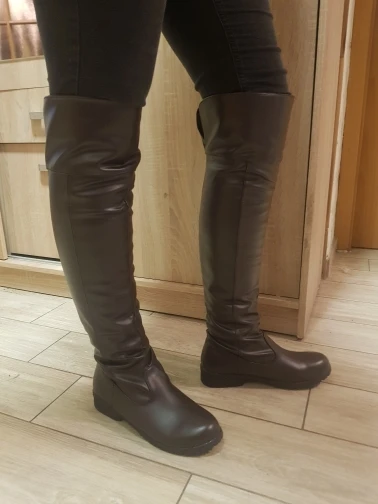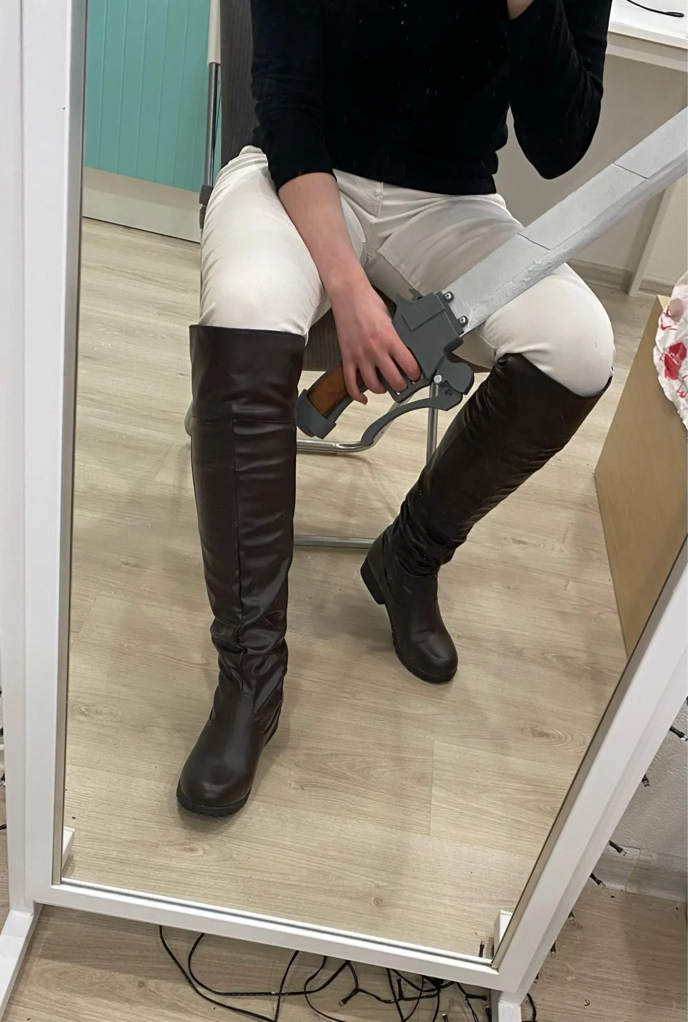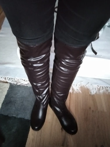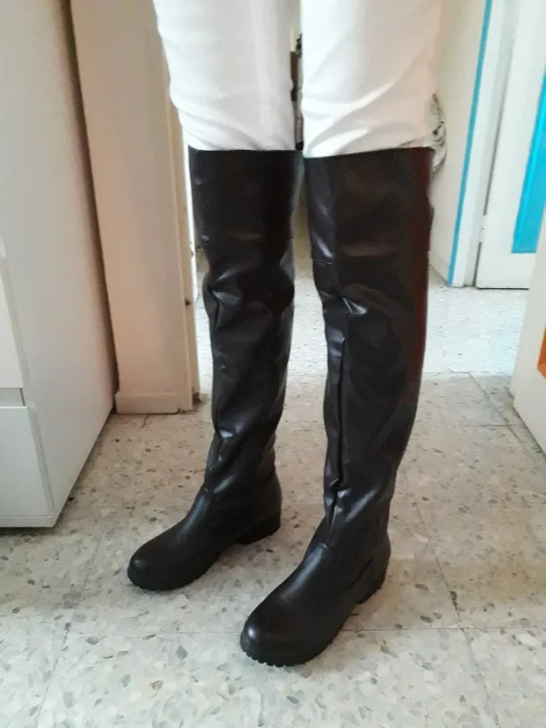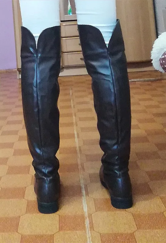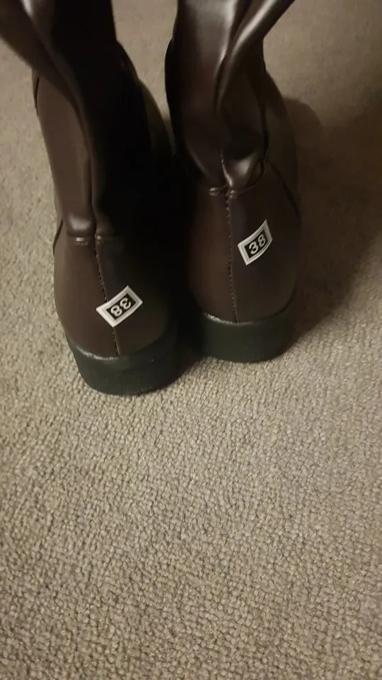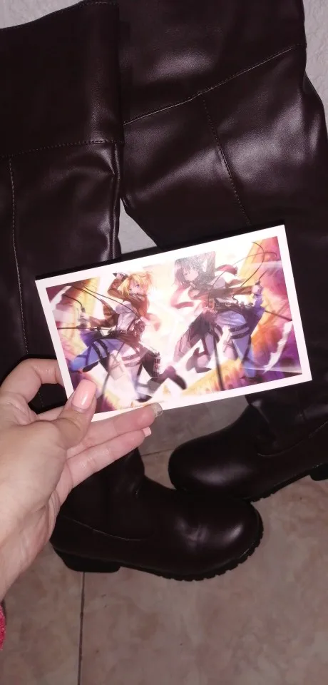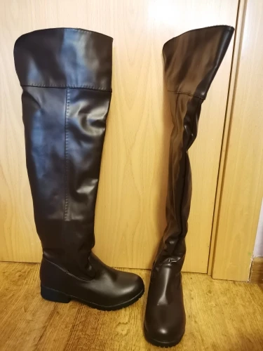 Сапожки шикарны! Для формы из атаки титанов, считаю, подойдут идеально. Посылка пришла чётко в указанный срок. Когда открыла пакет, был сильный запах клея, но он выветрится, так что не волнуйтесь. А так пахнут обычным кожзамом. Чтобы разровнять складки, думаю, можно погладить их на небольшой температуре утюгом через ткань. Подошва средненького качества. Немного видны следы клея на стыке подошвы, но этого почти незаметно. Швы ровные, аккуратные. Сапоги не тёплые, можно носить весной, ну, на осень может тоже пойдут, но не на позднюю. Насчёт размера, я ношу русский 38, но иногда бывает беру 39, так что решила подстраховаться и взяла 40. Подошли идеально, впритык. Так что берите на пару размеров больше, чем ваша обычная обувь. Никаких замочков и прорезей нет, но сапоги и так легко надеваются. С моим ростом 159 полностью закрывают колено. Снимаются тоже несложно. Продавец положил в подарок открытку и резиночку, очень мило :з В общем, сапоги хорошие, я довольна. Спасибо большое продавцу ❤️