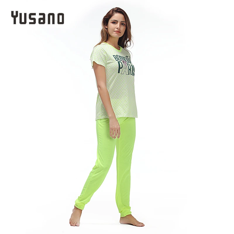 Женская пижама, хлопковая одежда для сна с коротким рукавом и милым сердечком, пижама с бантом и надписью, красный и зеленый цвета (футболка + длинные штаны)