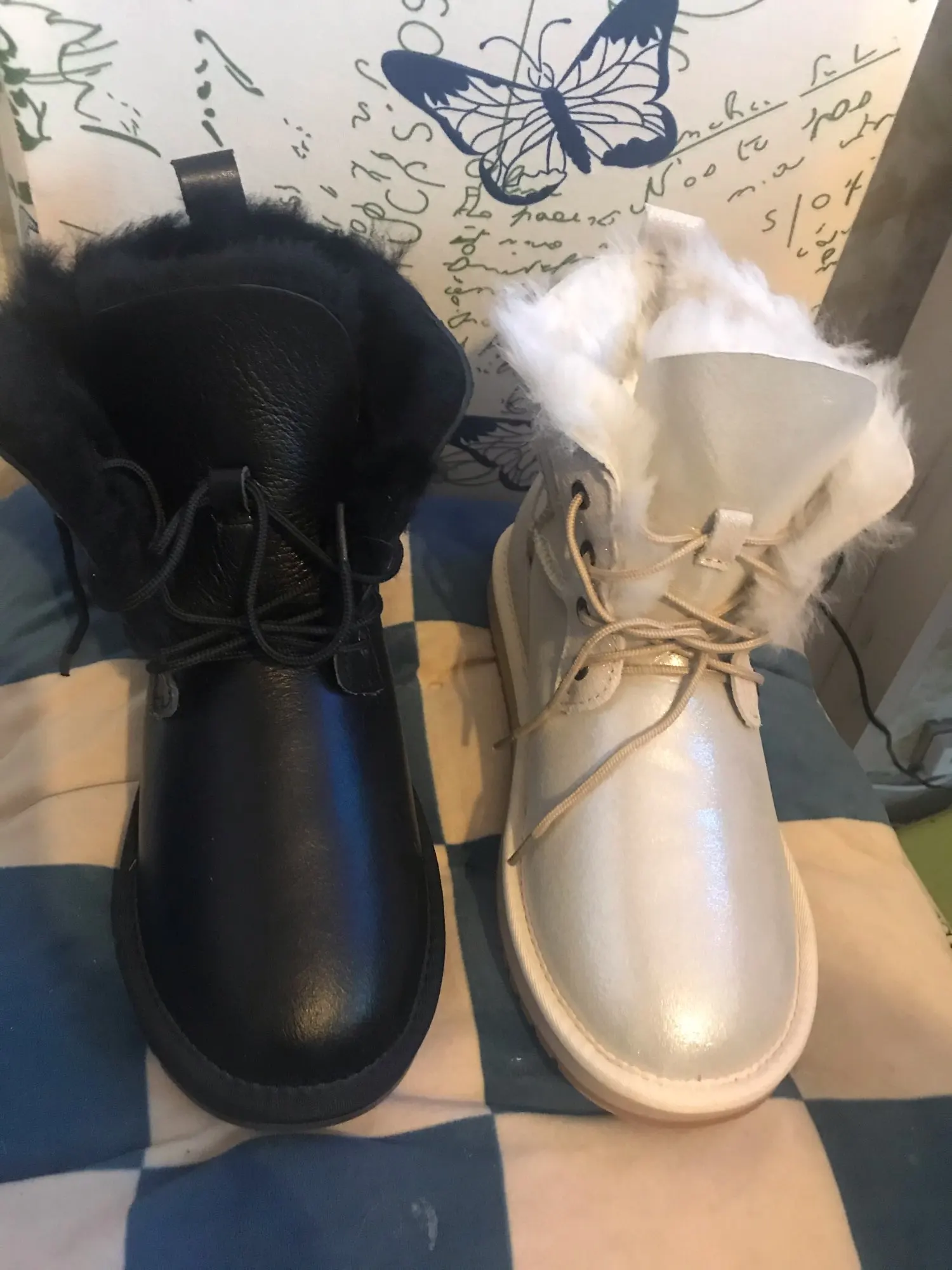 Ботинки отличные- натуральная кожа, натуральный мех. они очень удобные и мягкие. Мех толстый, греет очень хорошо. выглядят вживую в точности как на картинке. На свой 34 взяла 35. На мне он, конечно, как 36, если бы был размер меньше, то выбрала бы его. мне показалось, что они на широкую ногу. Буду носить на 2е толстых носков) одни, кстати, прислали в подарок, продавцу спасибо! Доставка до Москвы очень быстрая.