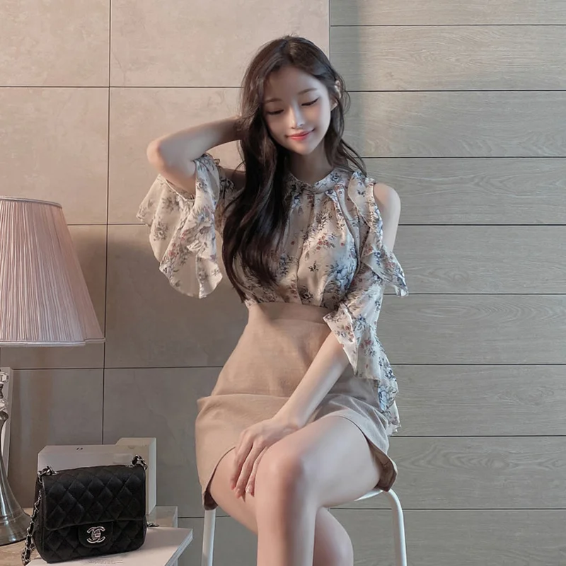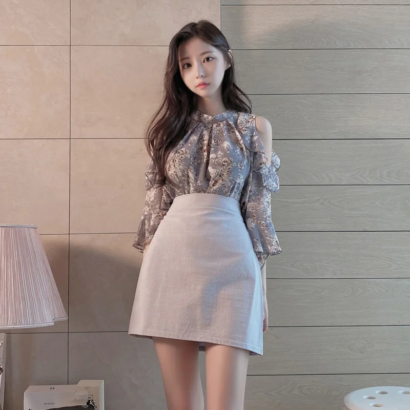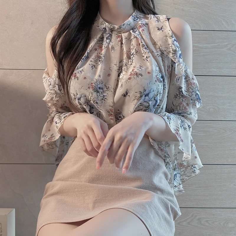 Женская шифоновая блузка, пуловер с открытыми плечами и цветочным принтом, свободная блузка с коротким рукавом, весна-лето, 9930