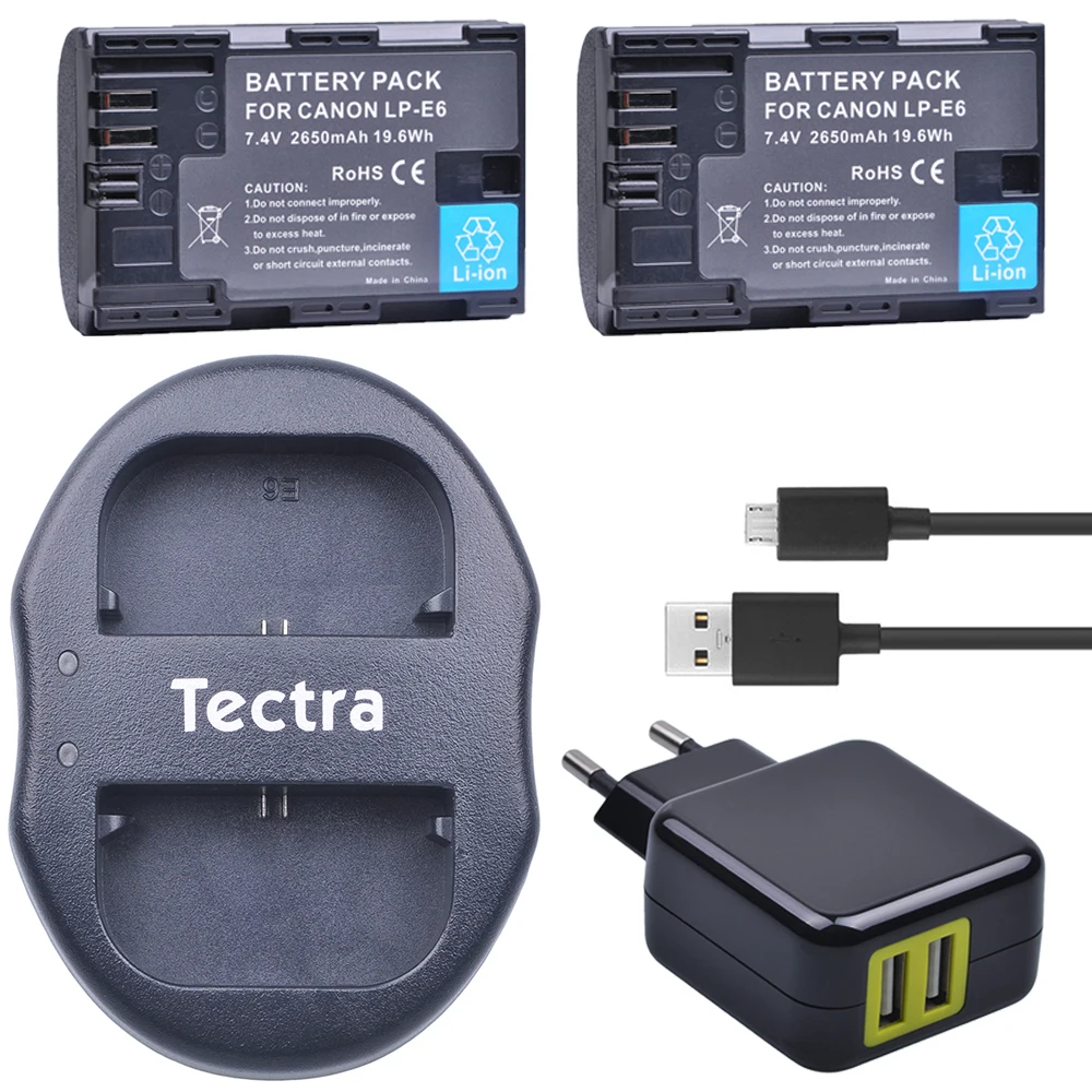 Tectra 2 шт. LP-E6 LP E6 LP-E6N литий-ионный аккумулятор + двойное зарядное устройство USB + адаптер переменного тока