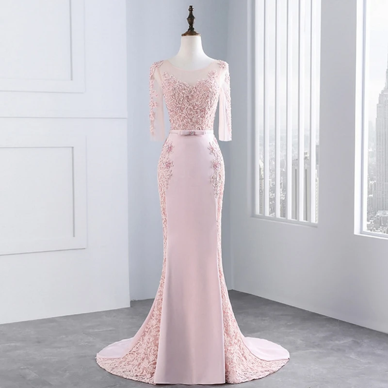 Женское вечернее платье-русалка, розовое кружевное платье с длинным рукавом для выпускного вечера