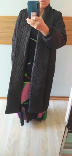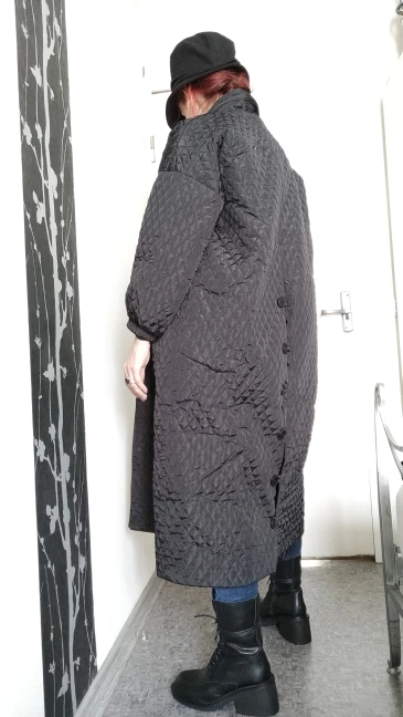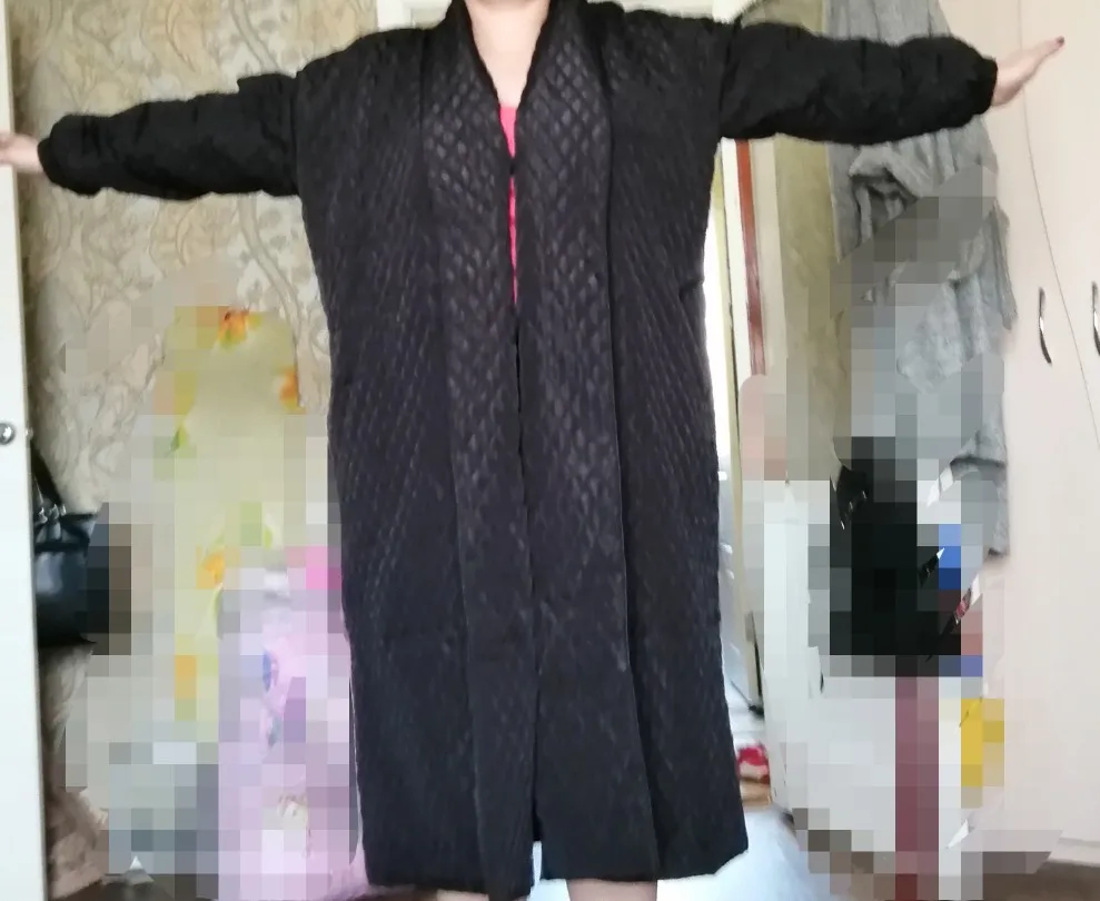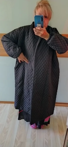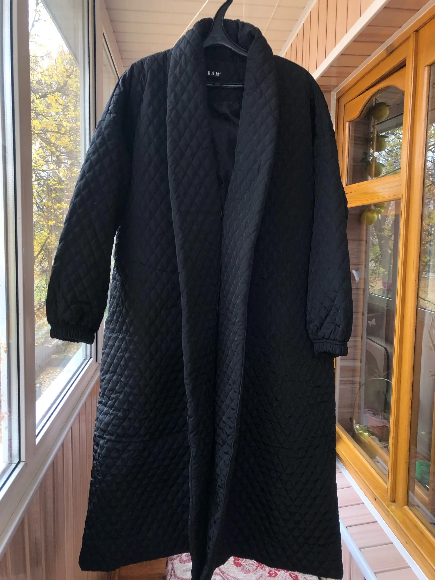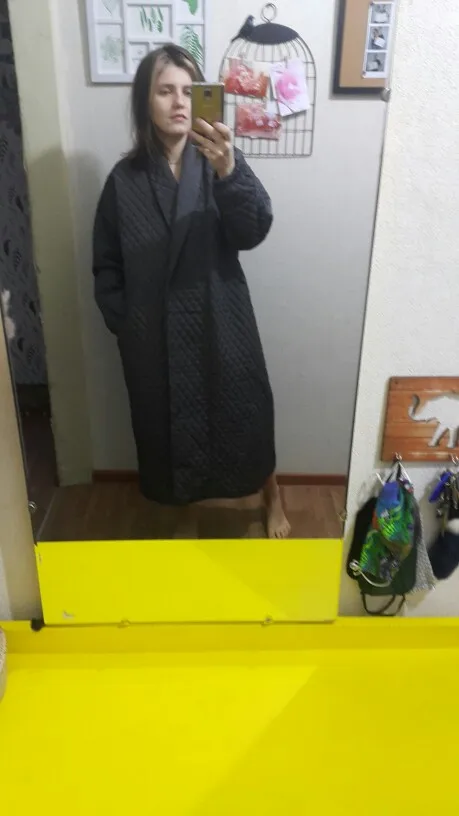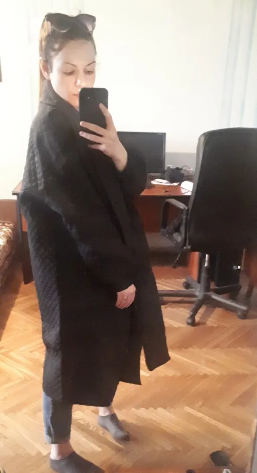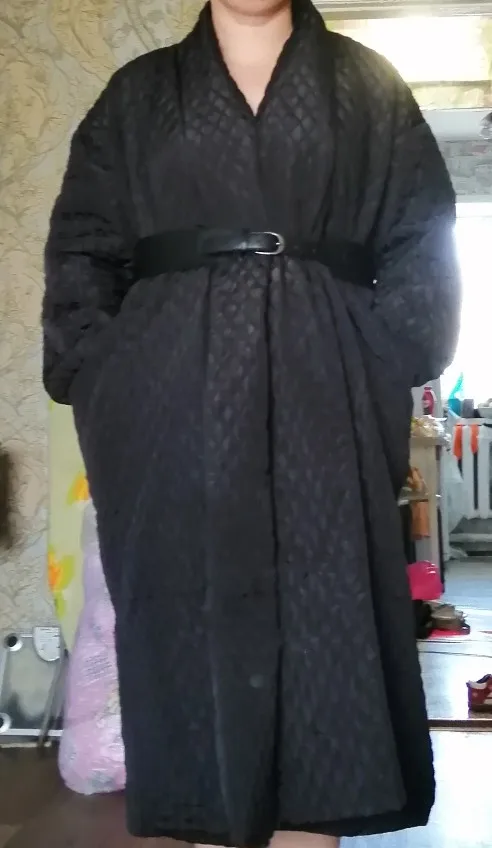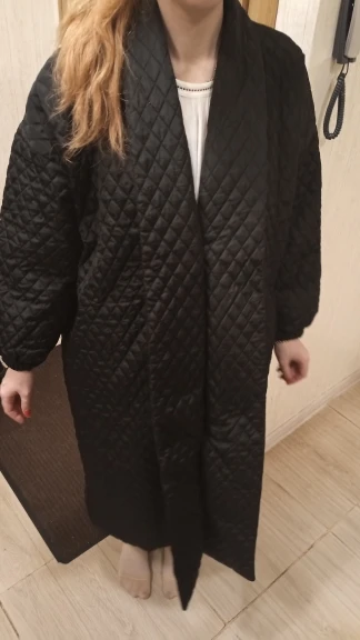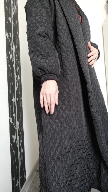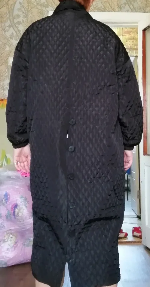 Пришло за 3 недели в объединении с другими заказанными товарами. Пальто крутое, длинное, интересное, кнопки спереди по всей длине, всё качественно выполнено. Думала оно теплее толще, но нет, оно достаточно тонкое в толщину, но по теплоте вполне среднее, дома при примерке уже через 5 минут становится жарковато. На осень, весну отлично, на тёплую зиму думаю тоже, на холодную зиму конечно не пойдёт, но эту зиму обещают тёплую. Ширина по одной стороне изделия 63 см, длина 116 см. Длина прям идеальная, сложно такую найти. На параметры: рост 162, ог120, от102, об120 село свободно, но не то чтобы прям очень много запаса, но из-за этих воротов спереди если натянуть, то в ширину пальто увеличится. Это пальто как конструктор, можно сделать всё под себя, сзади частично зашить разрез чтобы не задувало, распустить резину на рукавах если давит, (кстати рукава коротковаты), и носить можно и на запах с ремнём каким-нибудь, лентой, жаль в комплектации нет ремня из такого же материала, и просто на кнопк
