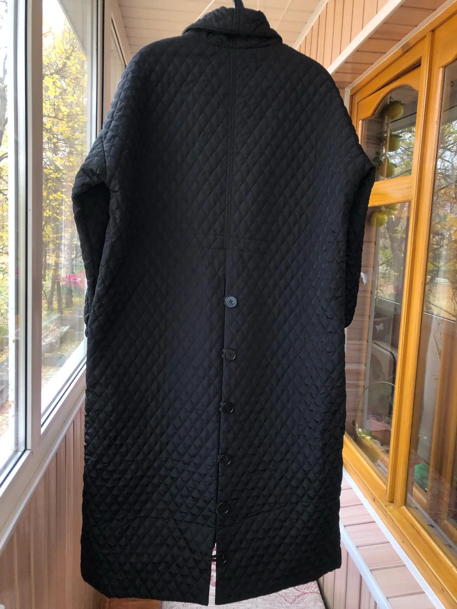 Пальто, как в описание, отличное стеганное одеялко. На мой рост 162 длина до середины икры. Размер одежды у меня S, сидит довольно свободно, есть желание носить с ремнем. Кнопки точно буду перешивать.