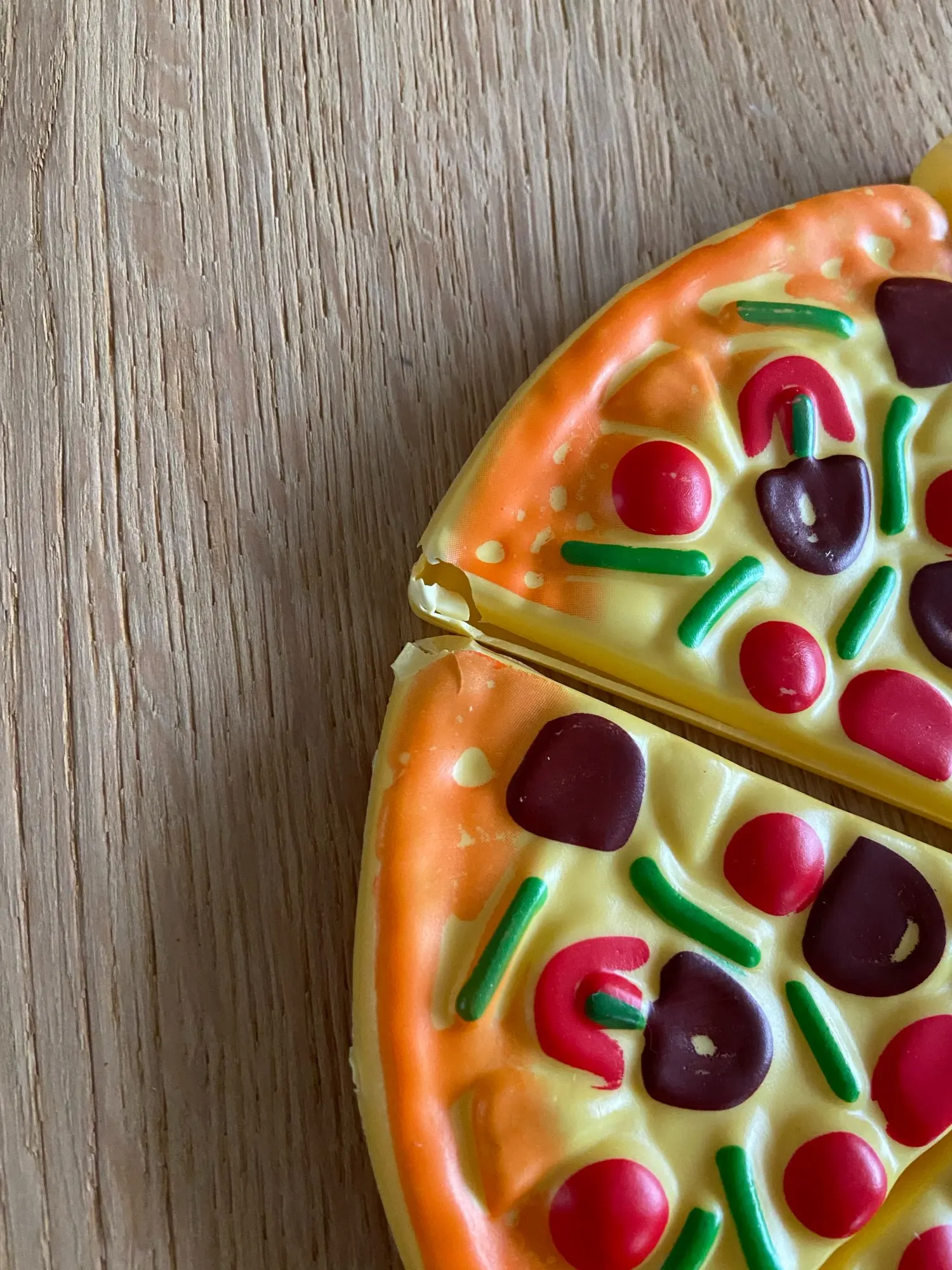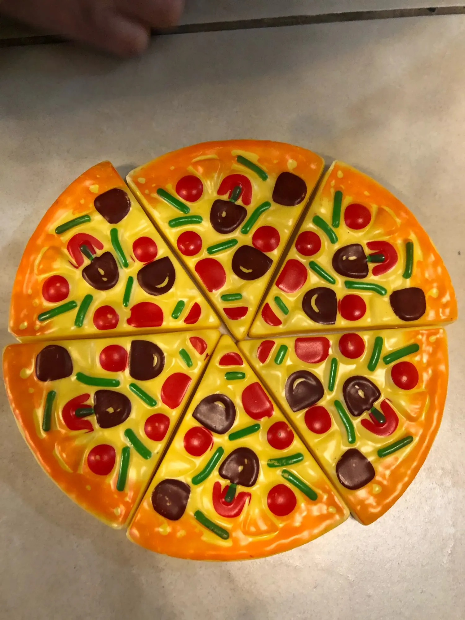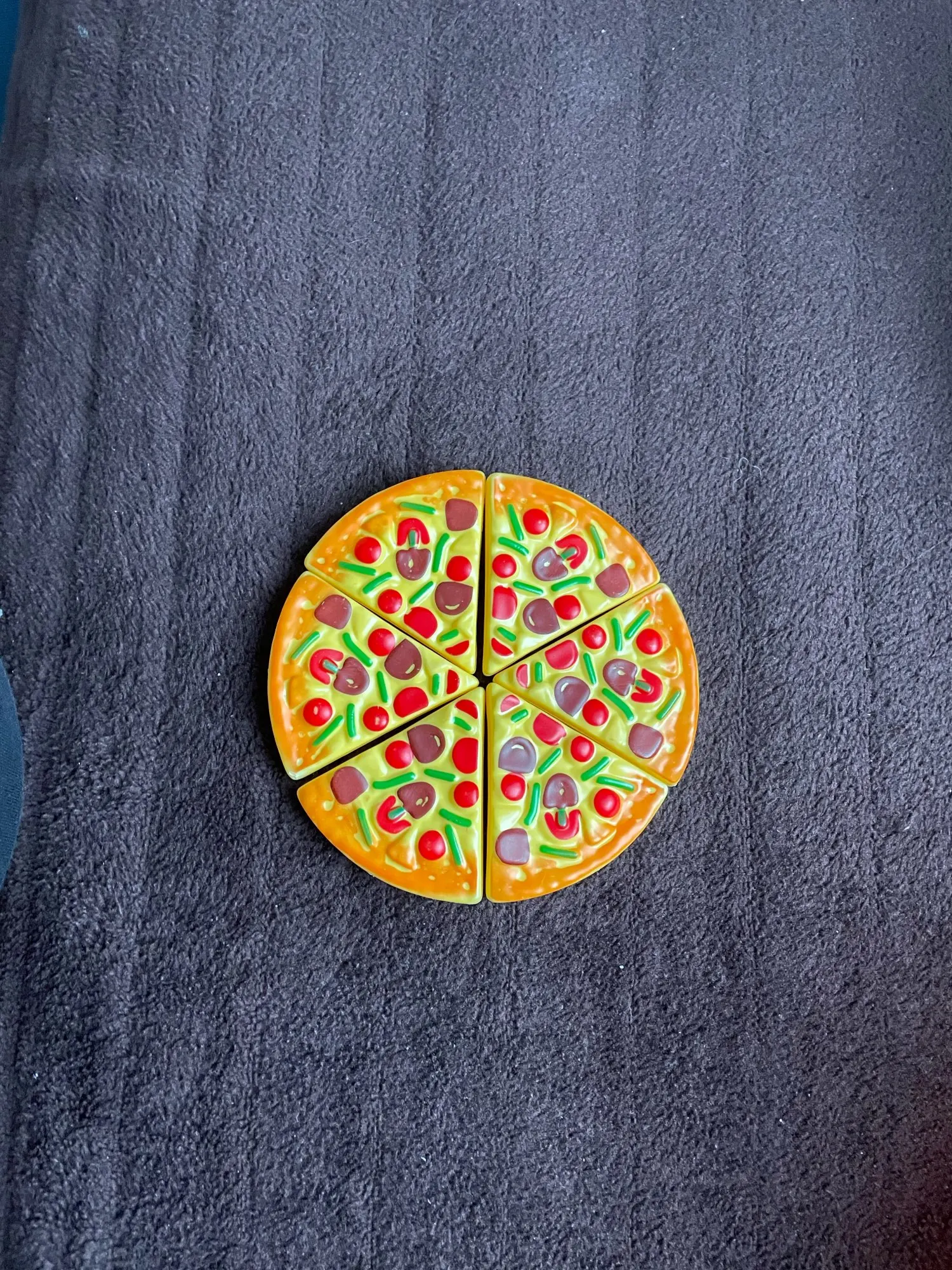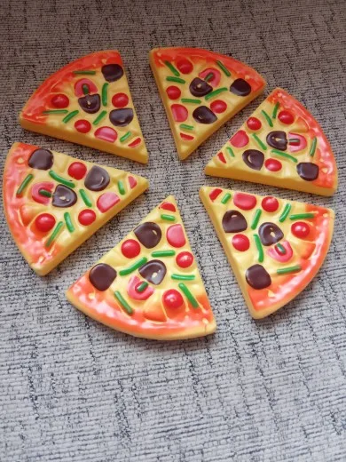 Небольшая пластиковая пицца,между собой кусочки никак не скрепляются, дети играют с удовольствием