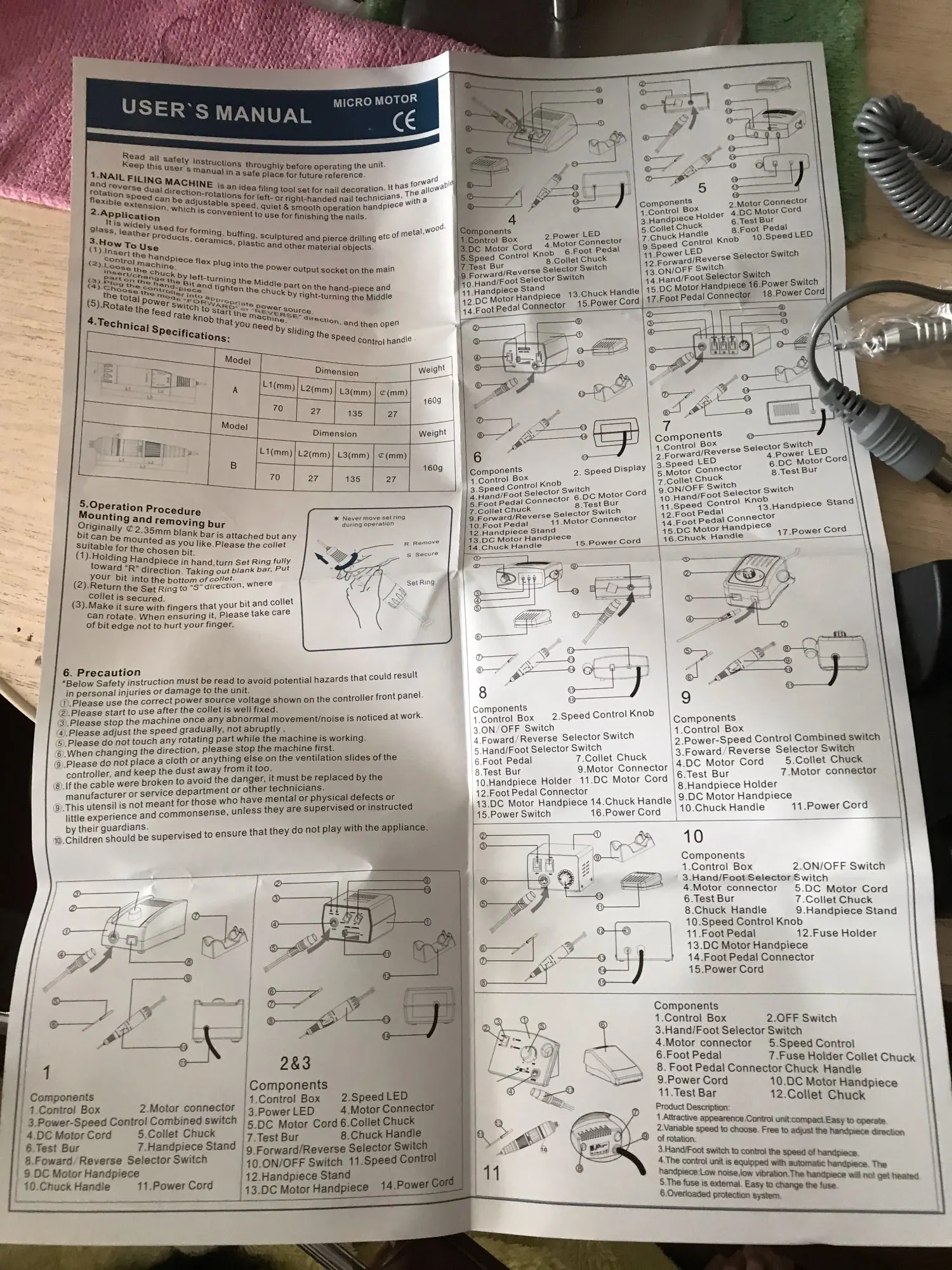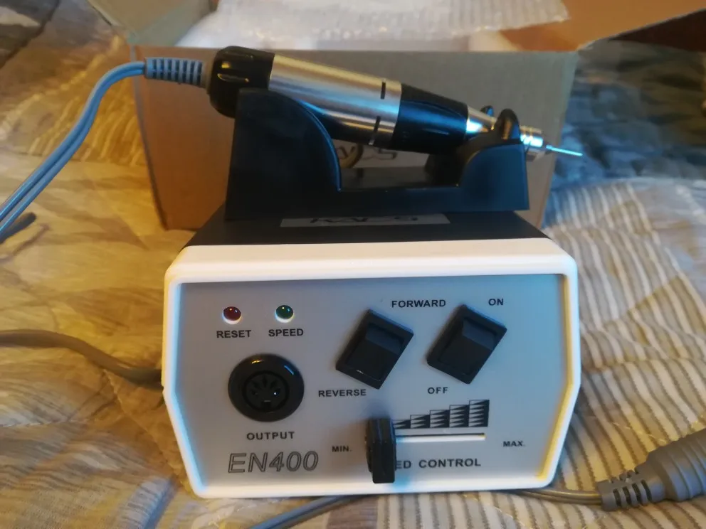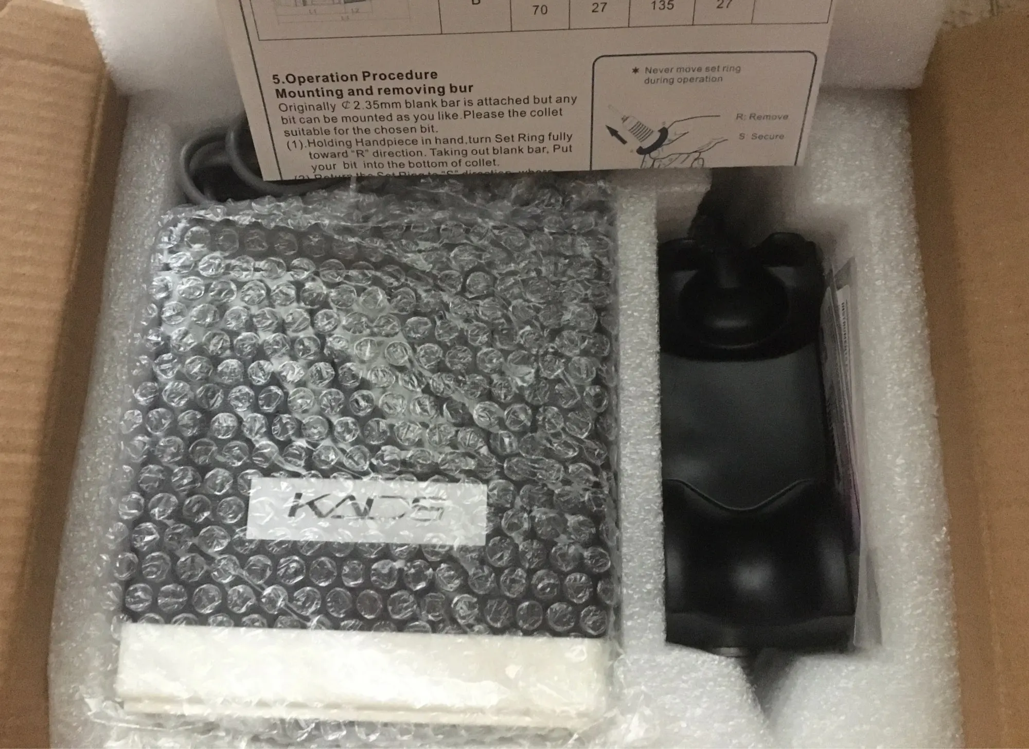 Заказ сделан 15.11, доставлен 27.11. Трек отслеживался, доставка в Нск курьером до двери, упаковано в пакет, затем картонку и потом полистирольную коробку со скотчем. Картонная коробка с углов помята. Всё работает, микромотор не шумный, вибрация незначительная. Инструкция на английском, фрезы в комплекте гамно
