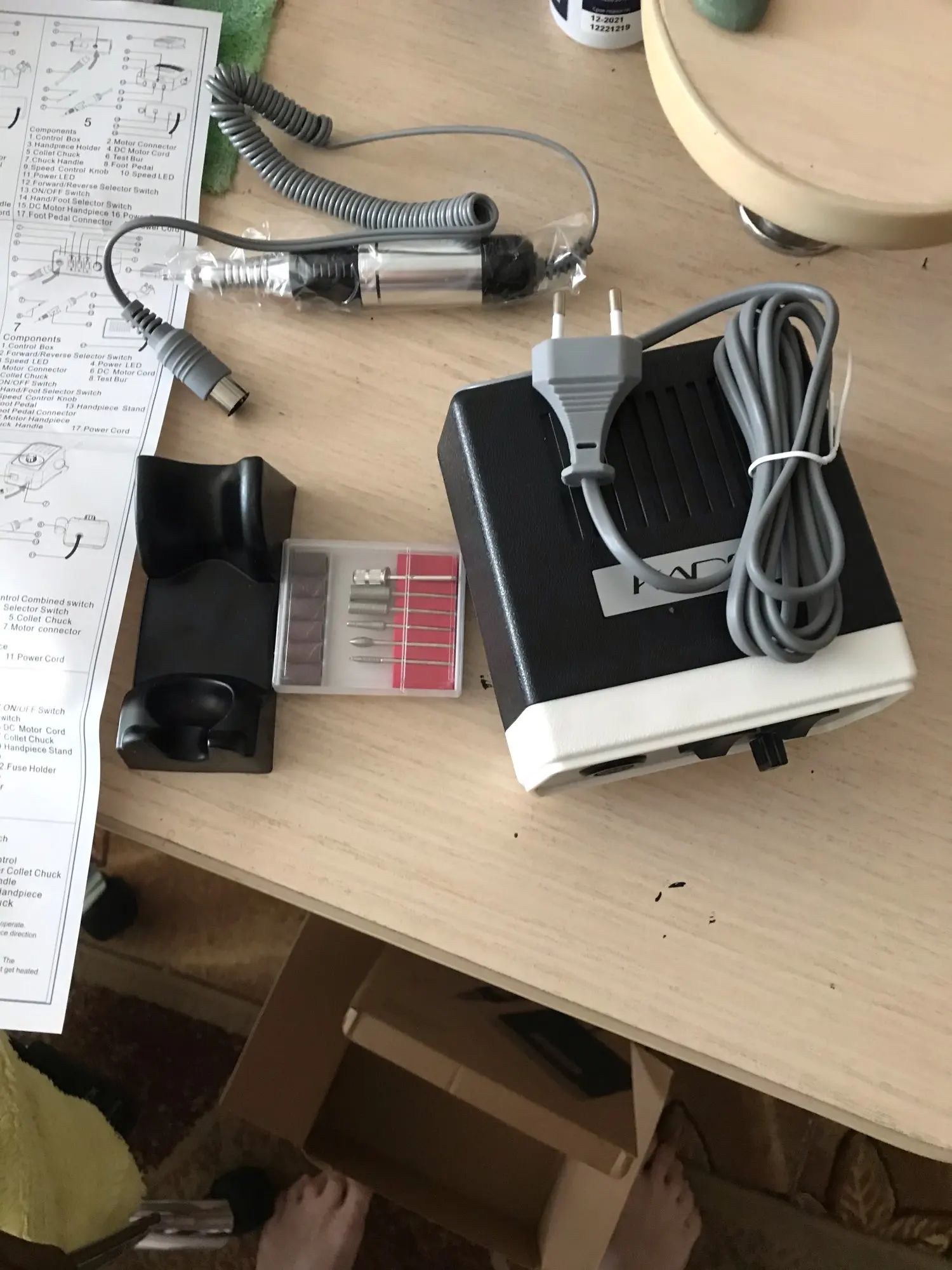 Посылка пришла быстро, доставка Сдеком. Упаковано в почтовый пакет и коробку. Аппарат хороший, для домашнего маникюра вообще отлично. Но на пятки мощности не хватит. Фрезы, идущие в наборе, ни на что не годятся, нужно сразу заказывать другие. Продавцу спасибо, рекомендую