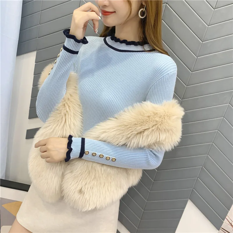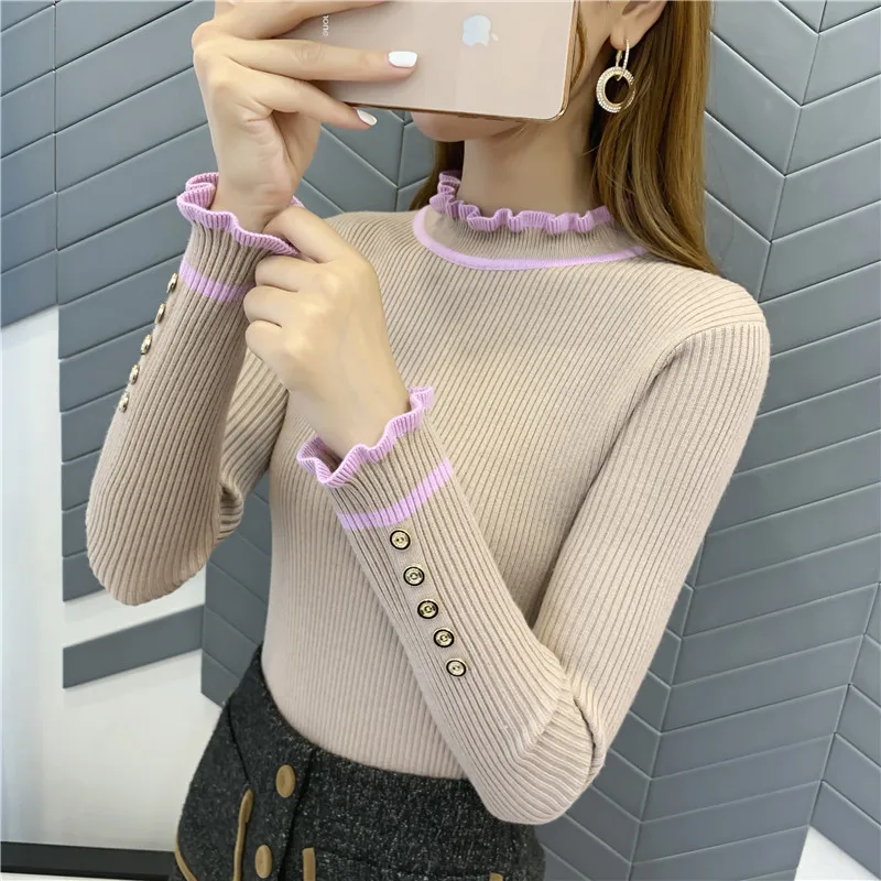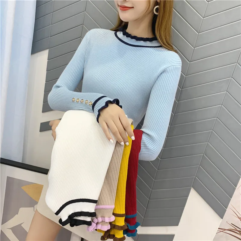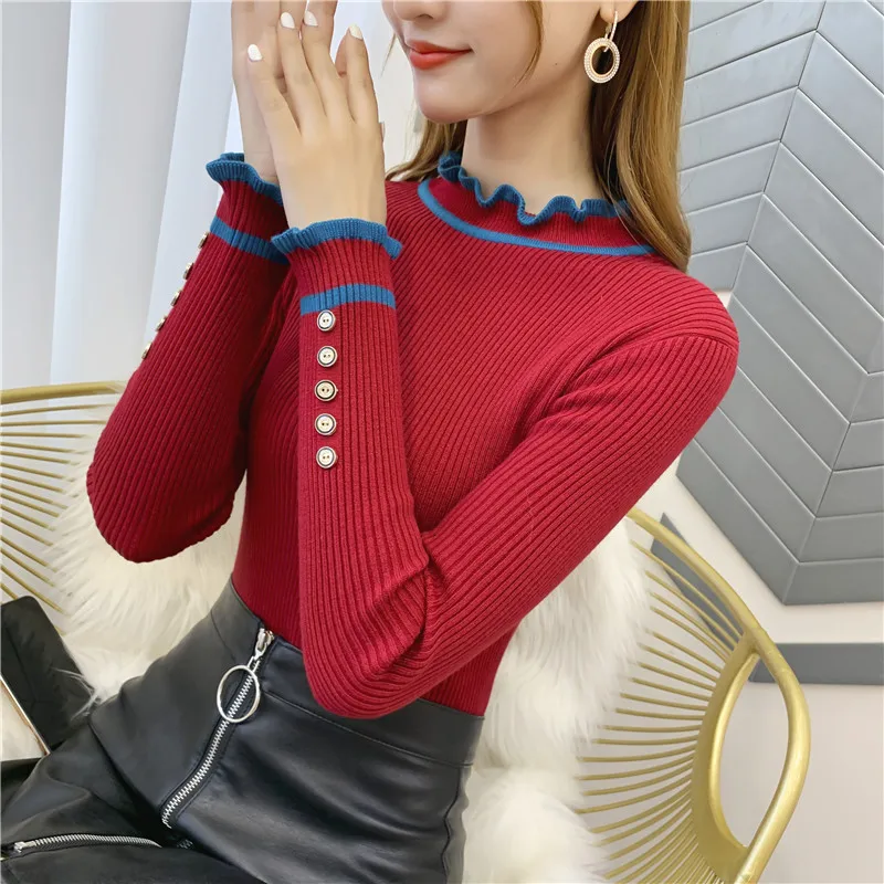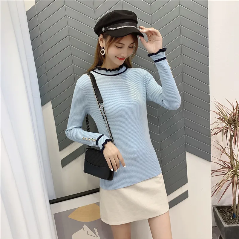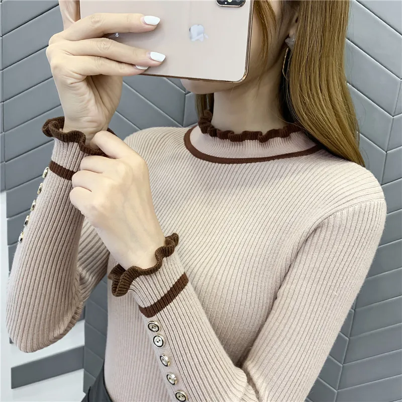 OHCLOTHING5344-женские свитера, новинка, Женский пуловер, высокая эластичность, оборка, трикотажный кружевной воротник, универсальная нижняя рубашка
