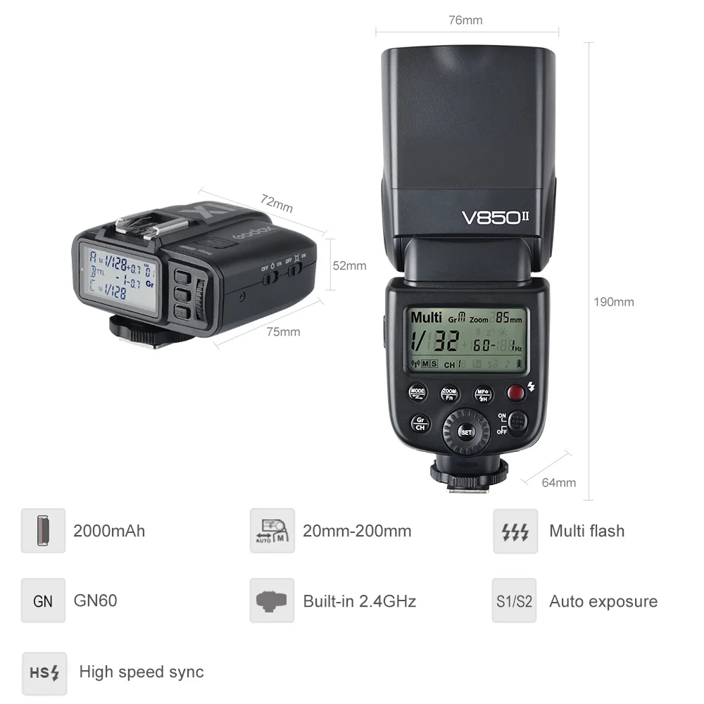 -Godox V850II может достичь 1/8000s высокоскоростных функций синхронизации при использовании в комбинации с высокоскоростными тригерами. e.g. Приемопередатчик Godox Cells II, беспроводной триггер вспышки X1 TTL и т. д.