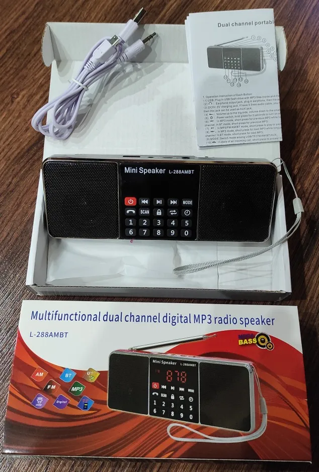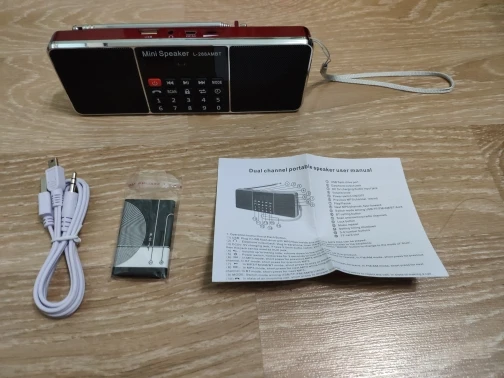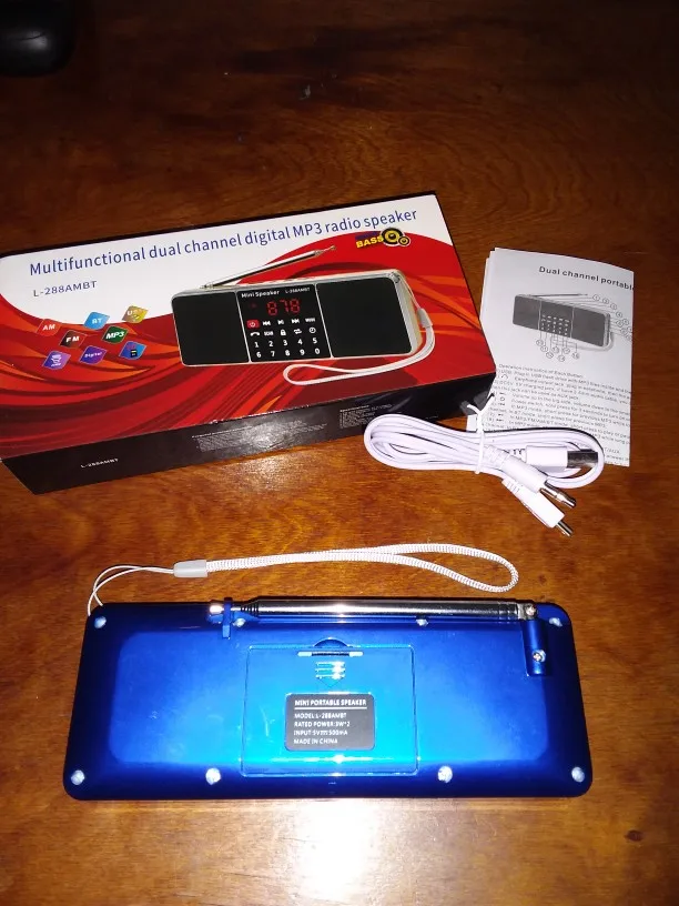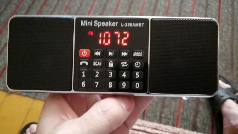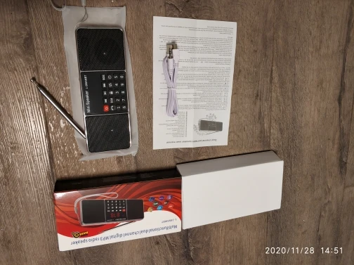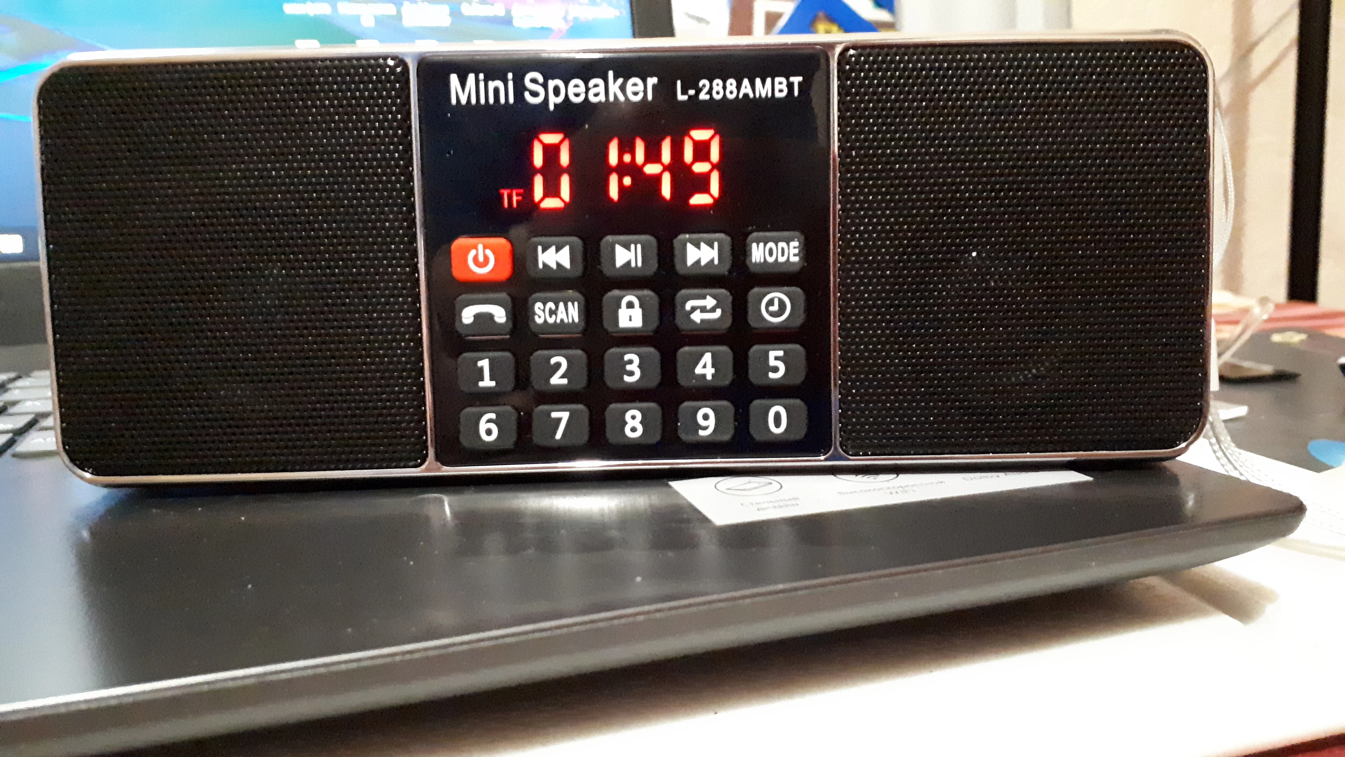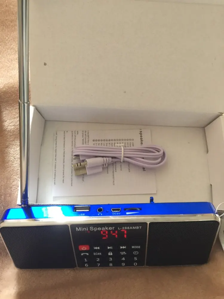 Доставлен за 5:дней в Московскую область курьером. Хороший прием FM, BT. Инструкция на англ., провод миниюсб AUX c подзарядкой. Колёсико громкости. Разъемы Usb, миниюсб, tfcard, 3.5мм на наушники. Громкий, ясный с басами но несколько грубоватый звук без вч, на любителя. Стерео. Ввод станций FM через номера после сканирования, либо числовым набором частоты, как на калькуляторе. Часов вроде нет, есть отсрочка выключения. Батарея телефонная bl5c, зарядка 5в 0.5А. Пока все замечательно.