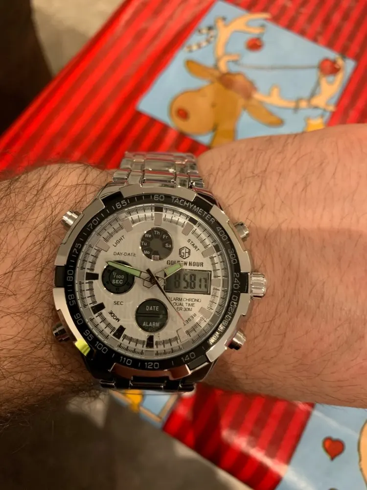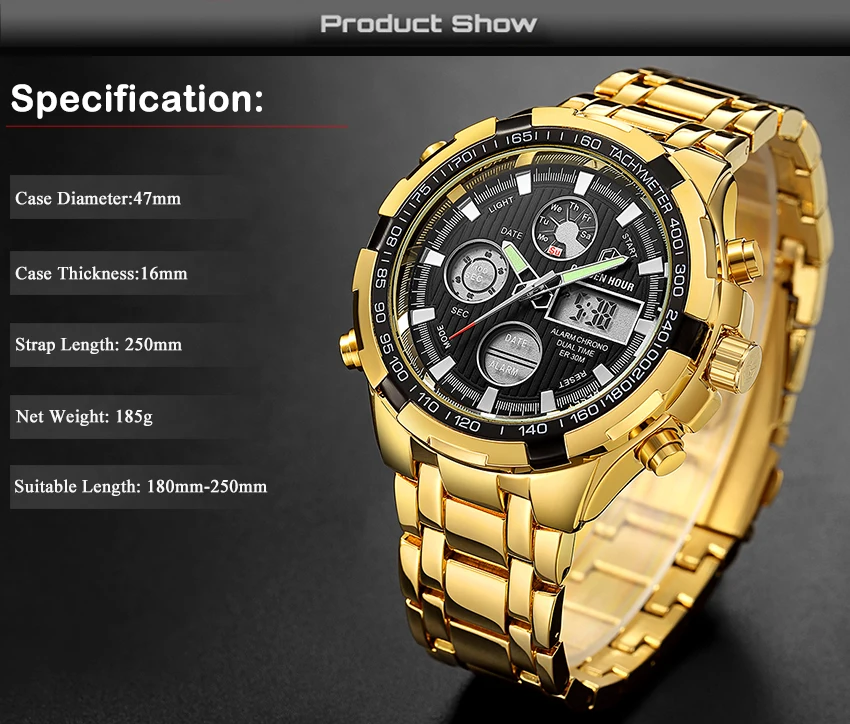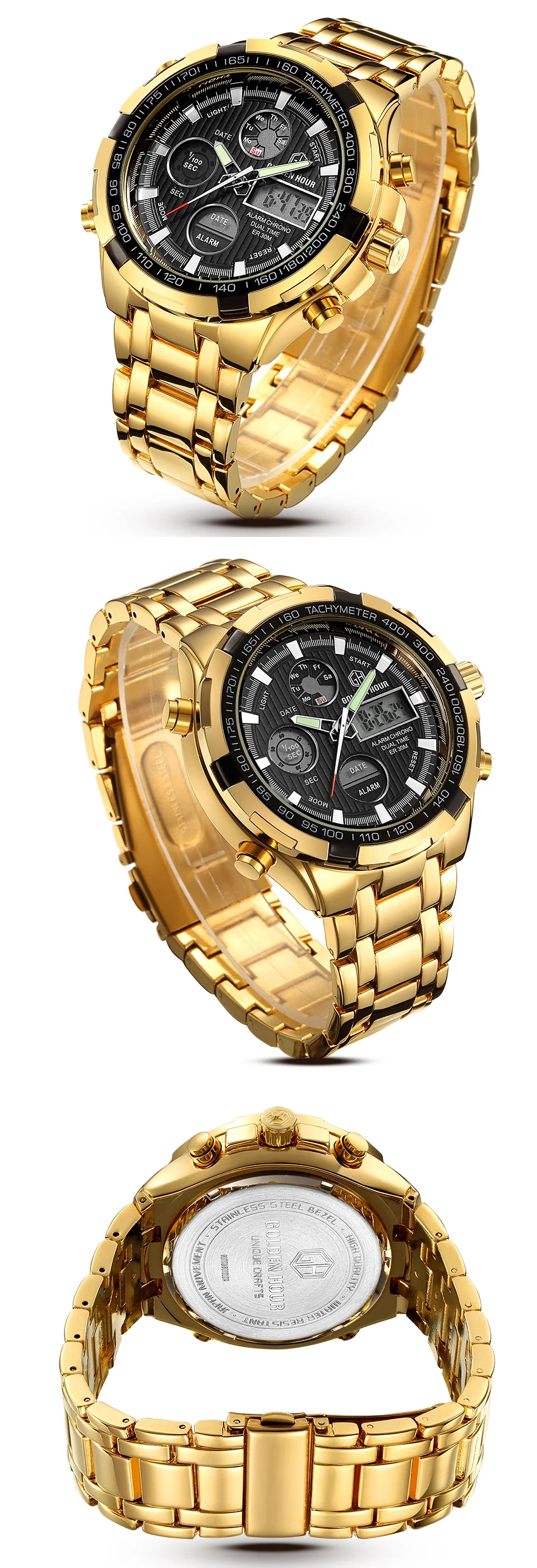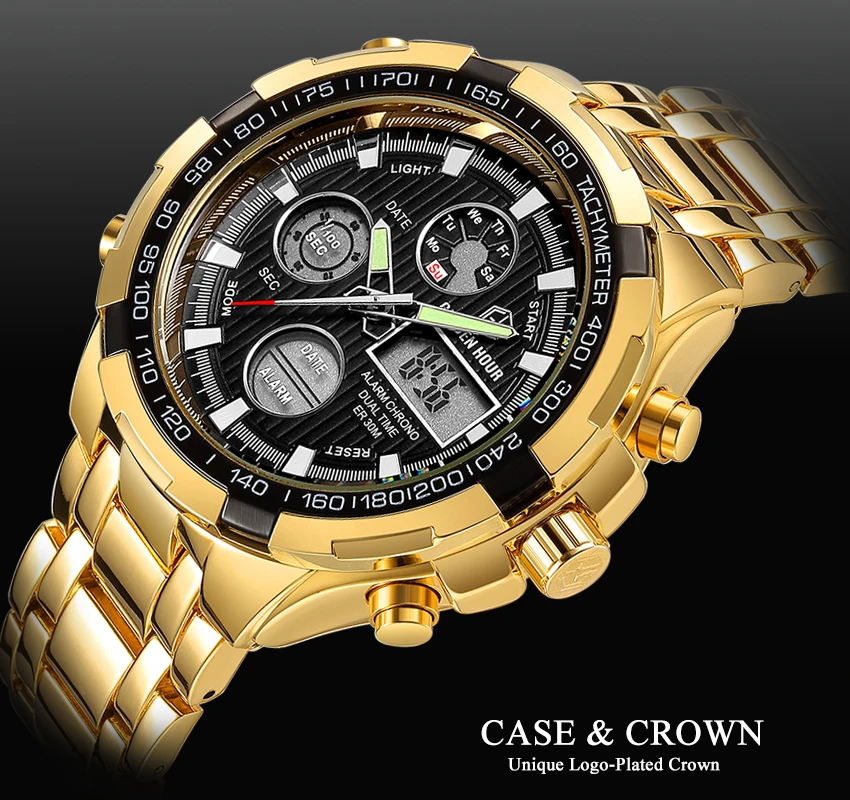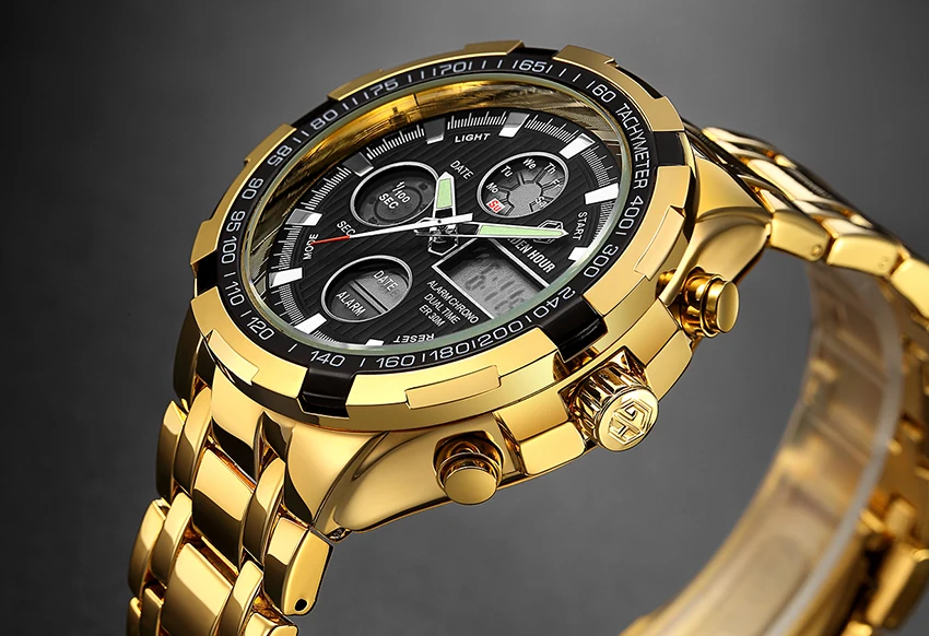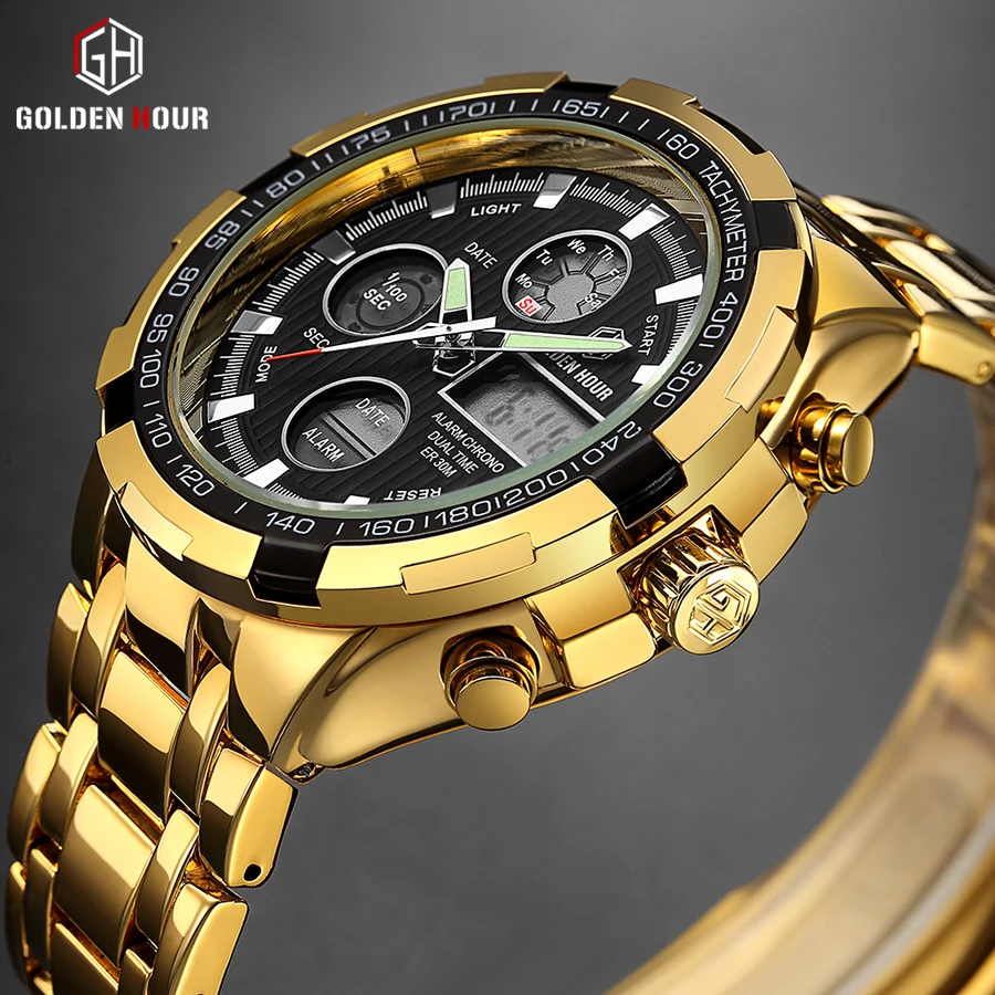 Часы наручные GOLDENHOUR Мужские кварцевые, роскошные брендовые модные спортивные цифровые аналоговые, полностью стальные
