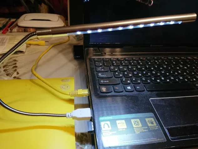Хорошо работает, хорошее освещение, достаточно длина кабеля при подключении к usb-порту на задней стороне ноутбука