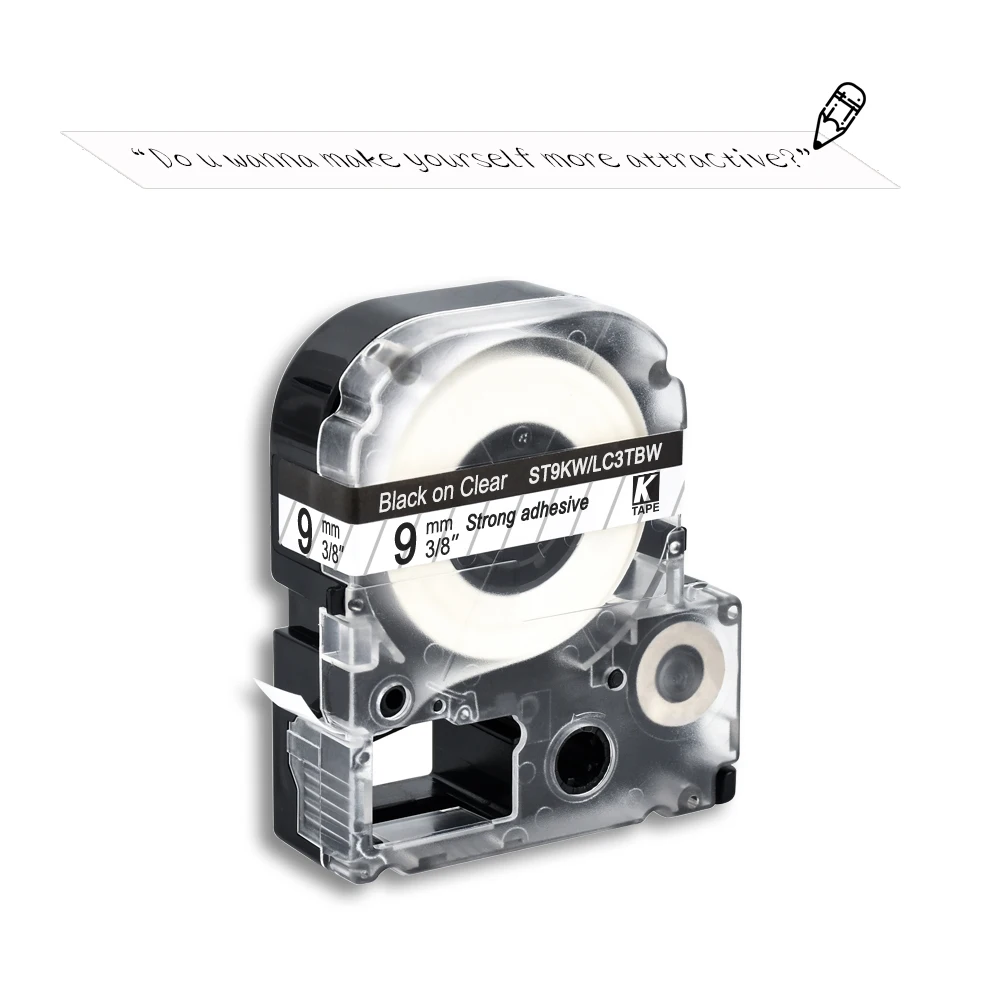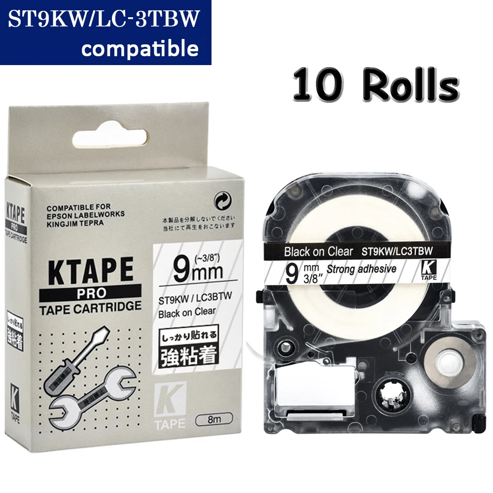 CIDY, 10 шт., 9 мм, черный на прозрачном ST9KWLC3TBW9, фотоклейкая лента для kingjimepson label maker LW400 LW600 SR150