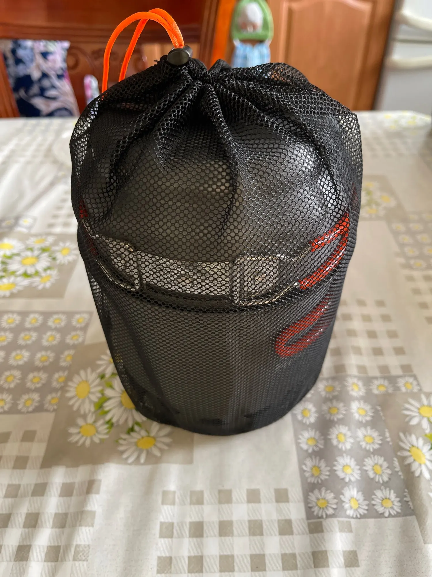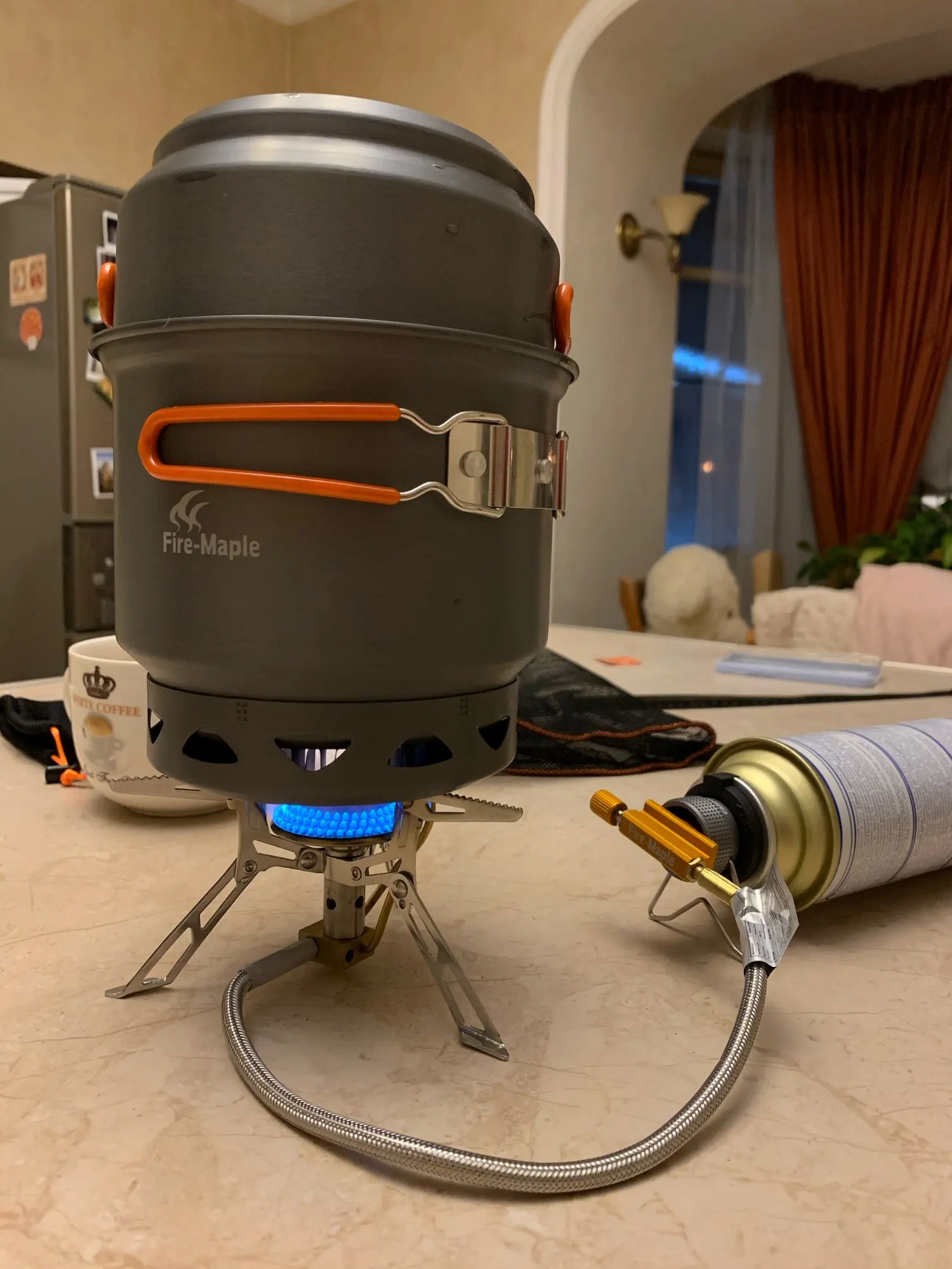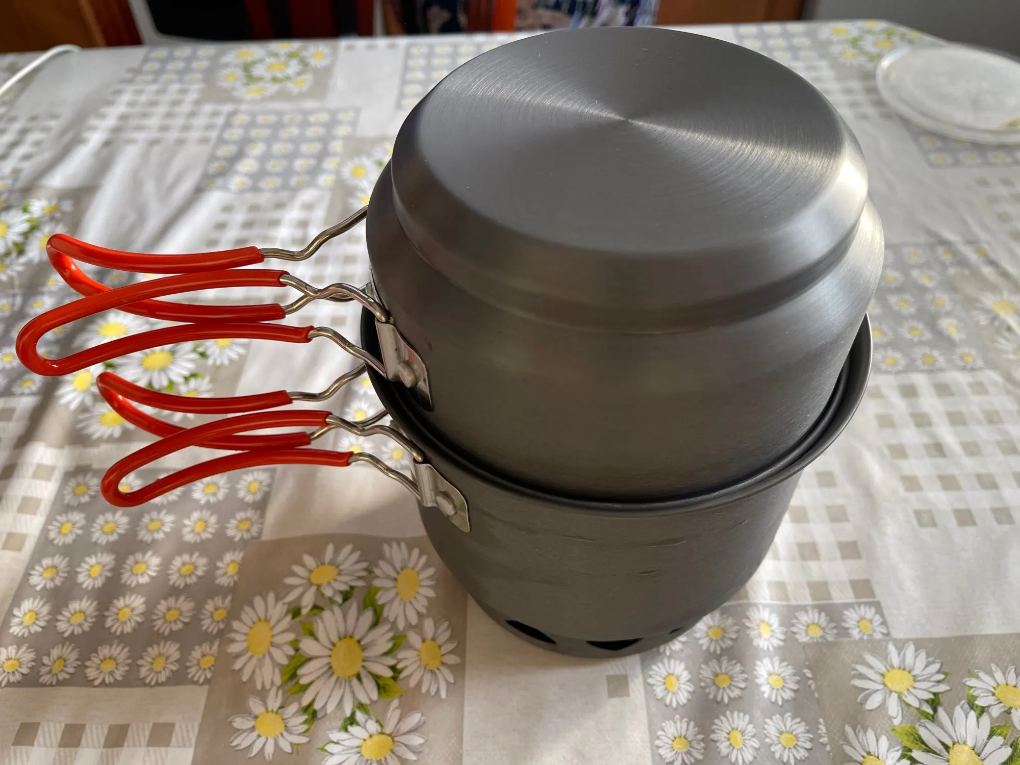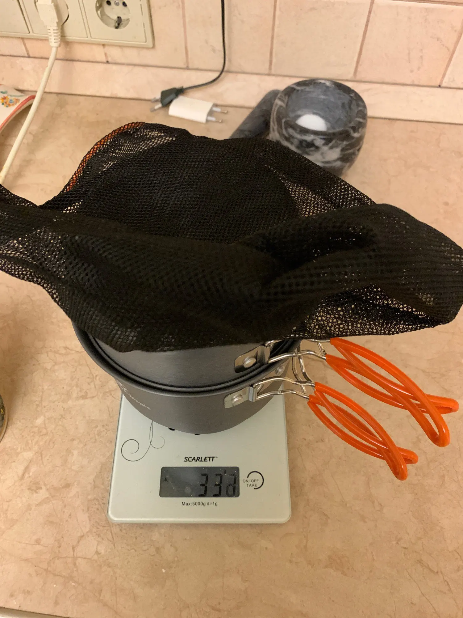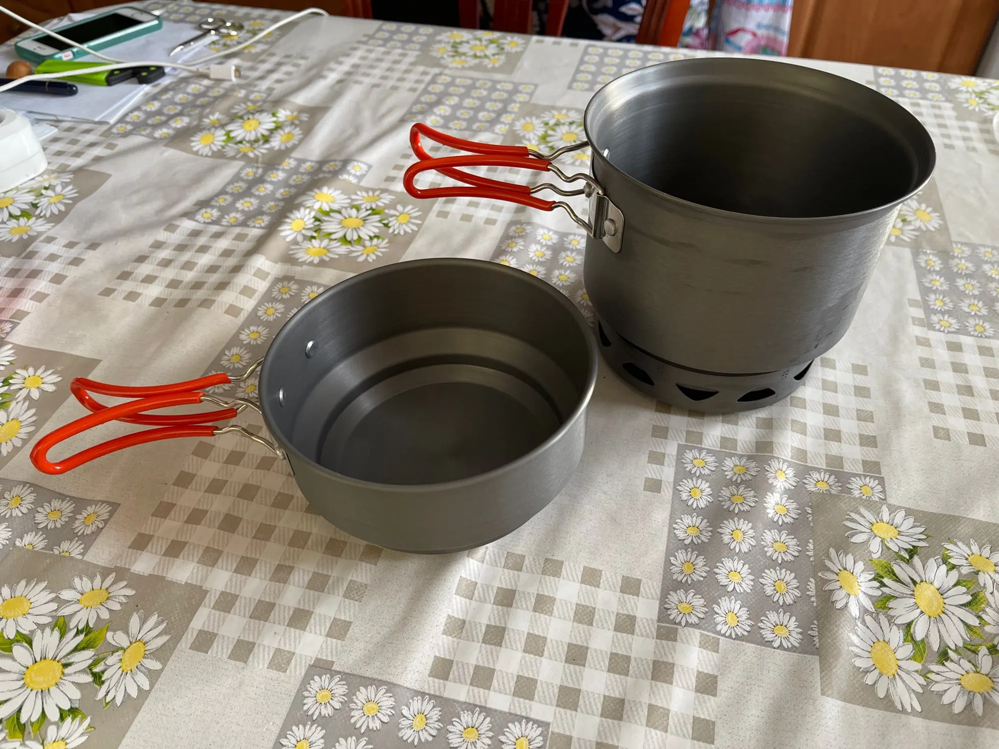 Отличный набор. Отправляли пол месяца и ещё месяц ехало до Питера. Из косяков- это непонятный неприятный запах при кипячении воды (надеюсь, уйдёт) и не плотно садится крышка, при закипание воды намеревалась перевернуться сама, так как перевешивали ручки, но это не критично все. Литр холодной воды из под крана в нем с горелкой fms118 закипел за 5.5 минут при расходе 8гр газа из дихлофосника дома при температуре в +23-24 градуса. Без чехла 314гр., но весы врут) В крышку под край 900мл, в котёл сам 1.5л до расширения под крышку.