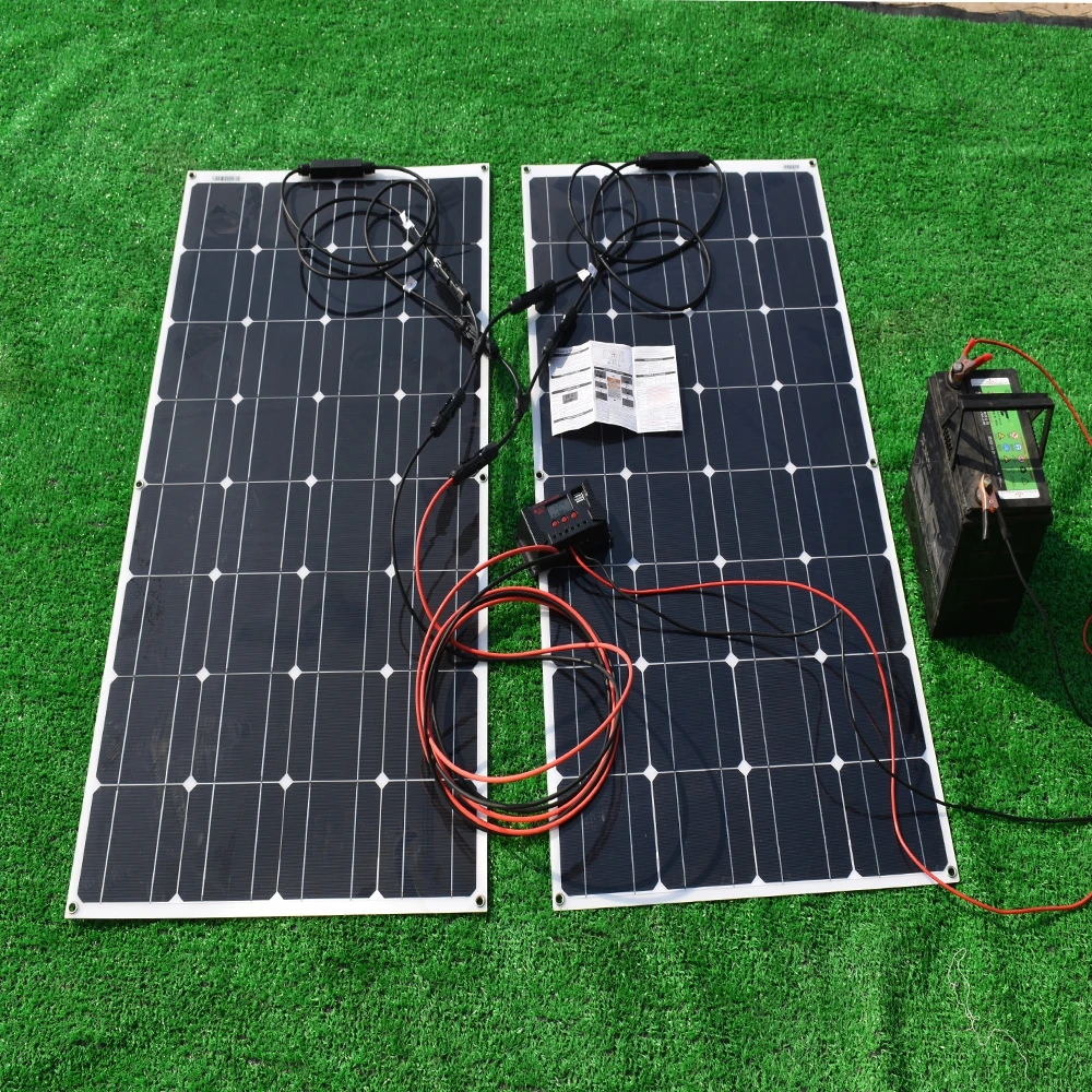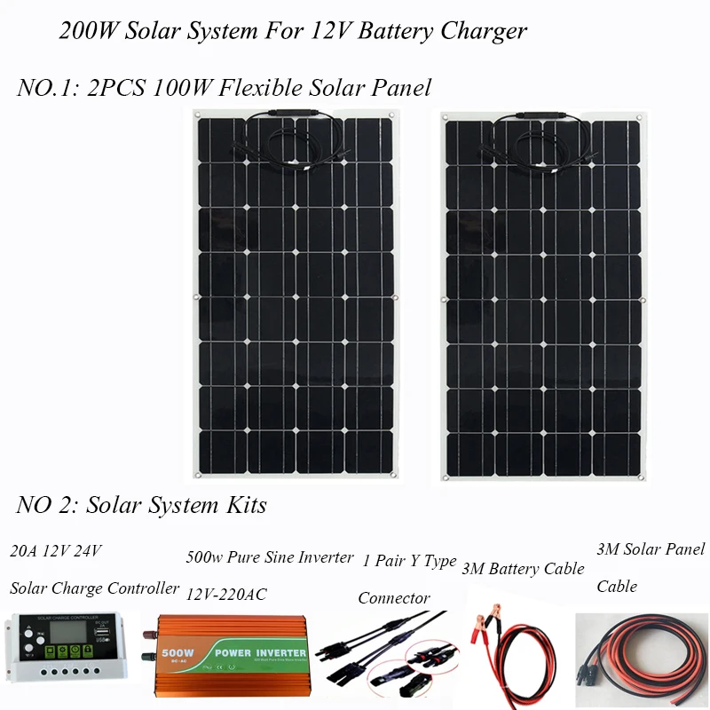 Гибкая солнечная панель 100 Вт, 2 шт; Размер: 1050 мм * 540 мм * 2,5 мм Автоматический контроллер заряда солнечной батареи pwm с ЖК-дисплеем 20 А, 12 В/24 В; 1 шт. Удлинительный Солнечный Кабель 3 м; Красный и черный; 1 комплект; Солнечный Кабель 3 м с зажимом крокодила; 1 комплект Y-образный разъем, штекер и гнездо; 1 комплект 500 Вт Чистый синус Wavert инвертор 12VDC-220AC