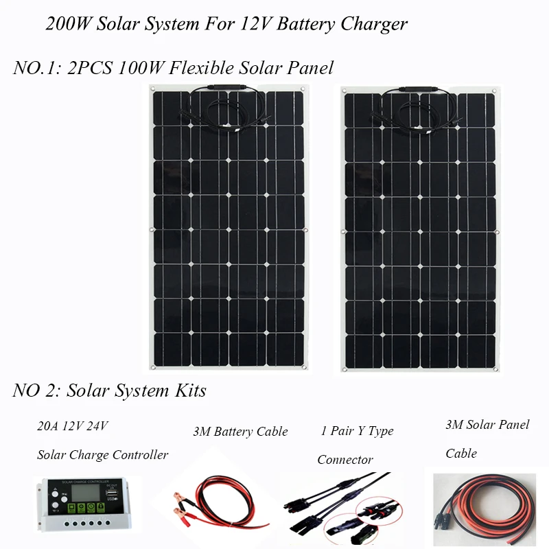 Гибкая солнечная панель 100 Вт 2 шт; Система солнечных панелей 200 Вт; ШИМ-контроллер 20 А 12 В/24 В; Y-образный Солнечный Кабель; Удлинительный Солнечный Кабель 3 м