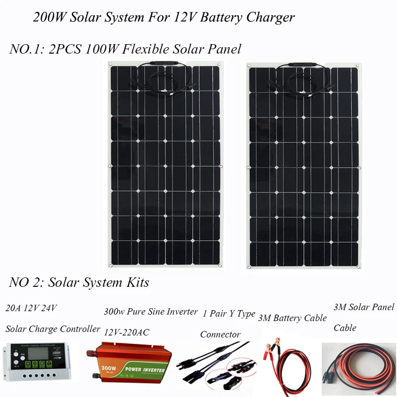 Гибкая солнечная панель 100 Вт, 2 шт; Размер: 1050 мм * 540 мм * 2,5 мм Автоматический контроллер заряда солнечной батареи pwm с ЖК-дисплеем 20 А, 12 В/24 В; 1 шт. Удлинительный Солнечный Кабель 3 м; Красный и черный; 1 комплект; Солнечный Кабель 3 м с зажимом крокодила; 1 комплект Y-образный разъем, штекер и гнездо; 1 комплект 300 Вт Чистый синус Wavert инвертор 12VDC-220AC