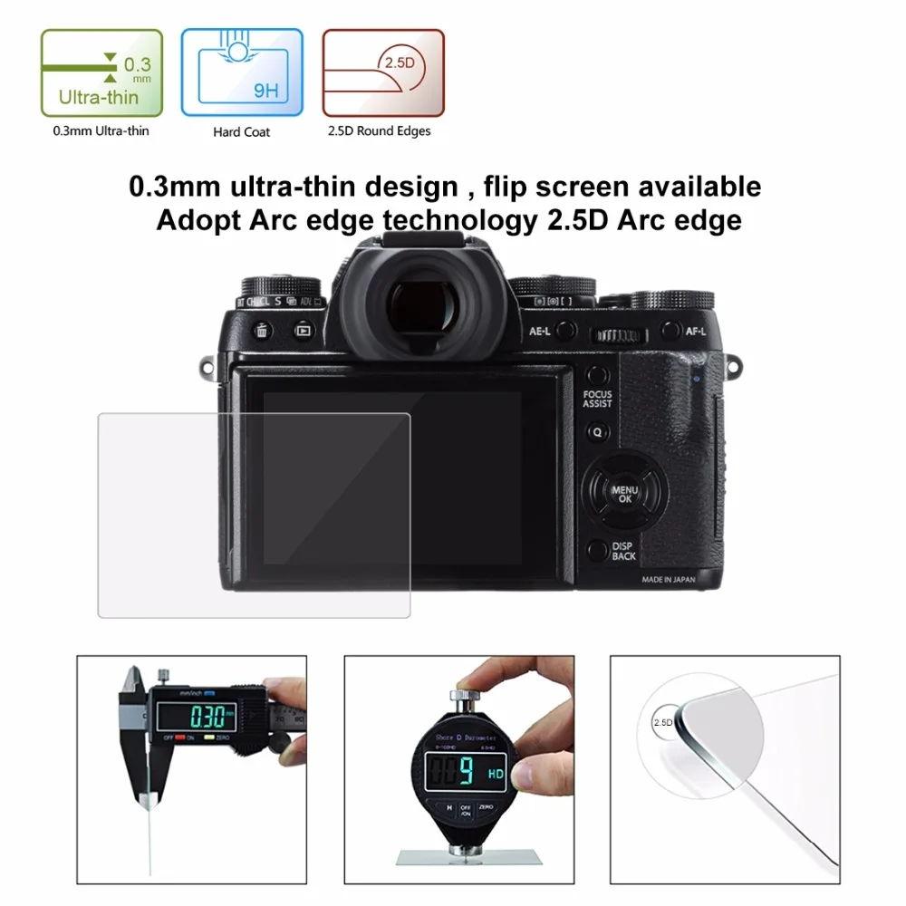 ОбщиеСовместим сFUJIFILM: X-T2, X-T1МатериалЗакаленное СтеклоРазмеры77,5*51,5 ммВес3gПосылка включает в себяПосылка содержание1 x Экран протекторСалфетка для протирки (1 шт.)Пылепоглотитель-1 шт.1 спиртовая салфетка