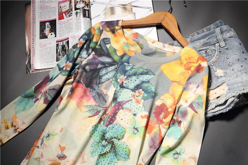 Женская футболка с цветочным принтом, круглым вырезом и длинным рукавом