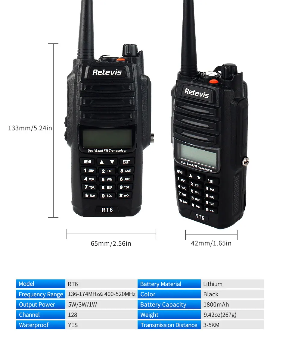 Рация Retevis RT6 Водонепроницаемая IP67 5 Вт 128 каналов, УКВ, УВЧ, радио, VOX, FM, ЖК-дисплей, портативная