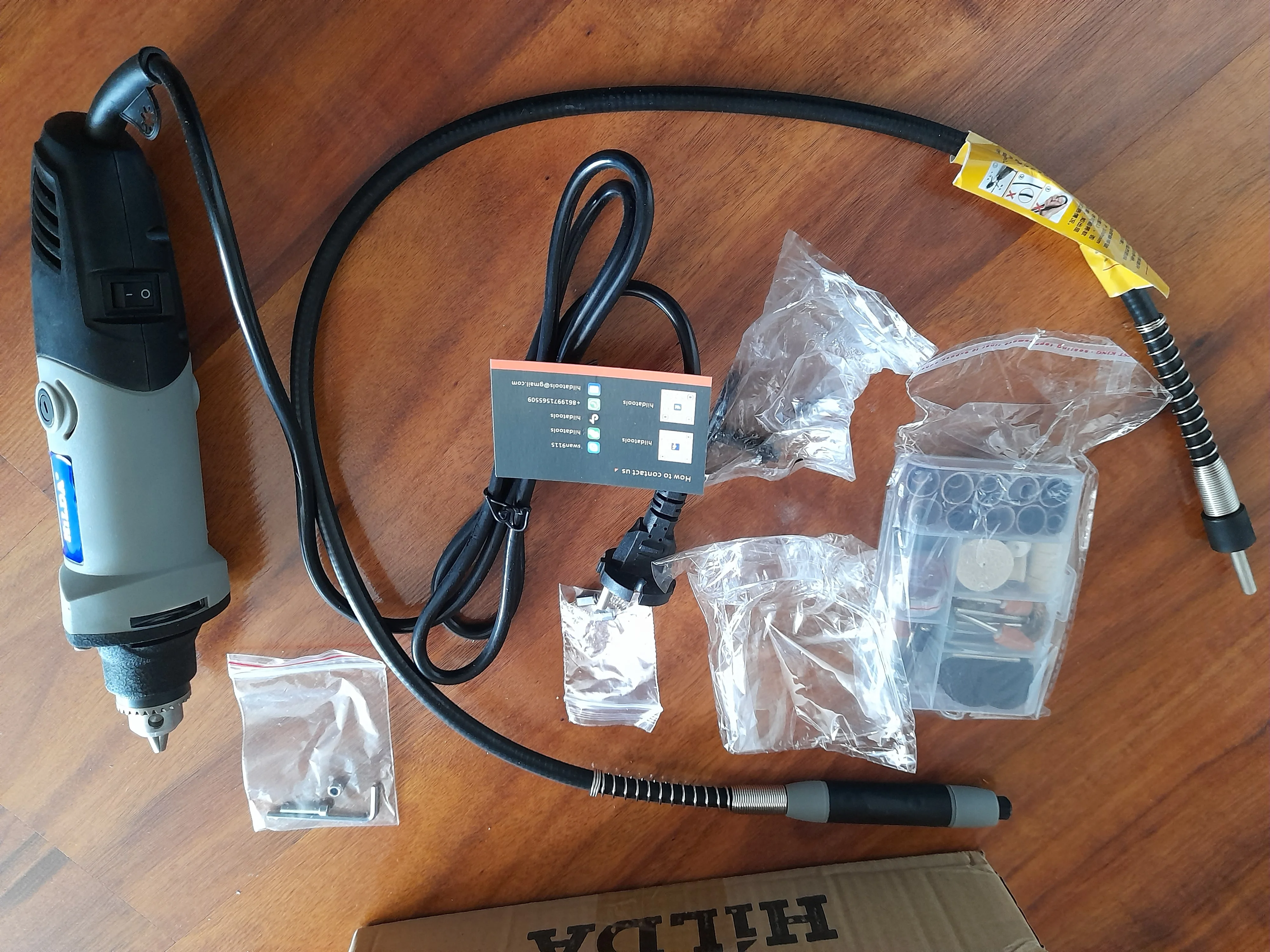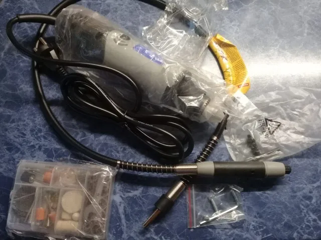 Дошло до Питера за 5 дней, доставлено курьером. Комплектация соответствует. Вид не очень товарный (отклеянные логотипы). Работает тихо, боя и люфта на самом дремеле нет, чего не скажешь о работе гибкого вала. Инструмент не профессиональный и ждать от него много не стоит, а вот для дома я бы посоветовал.