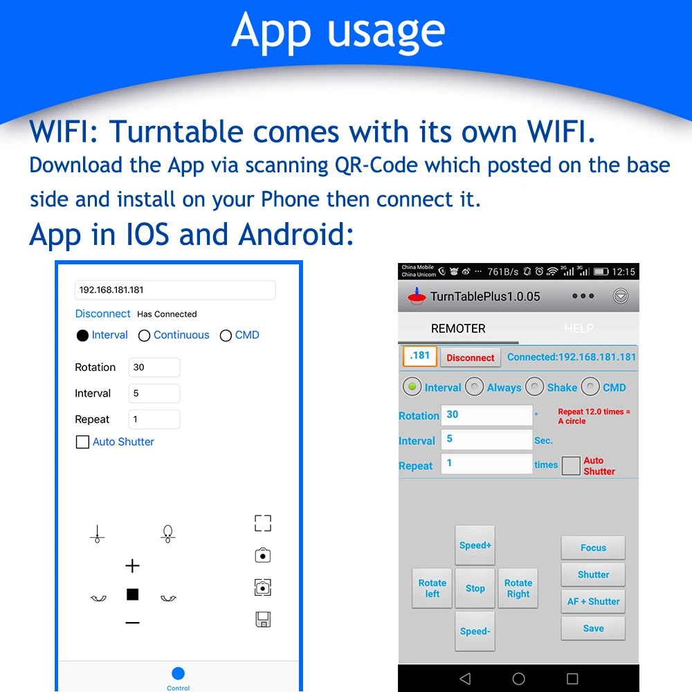 Wi-Fi: поворотный стол поставляется с собственным Wi-Fi. Скачайте приложение через сканирование QR-кода, который размещен на базовой стороне. Установите на свой телефон, затем подключите его, чтобы удобно использовать его.