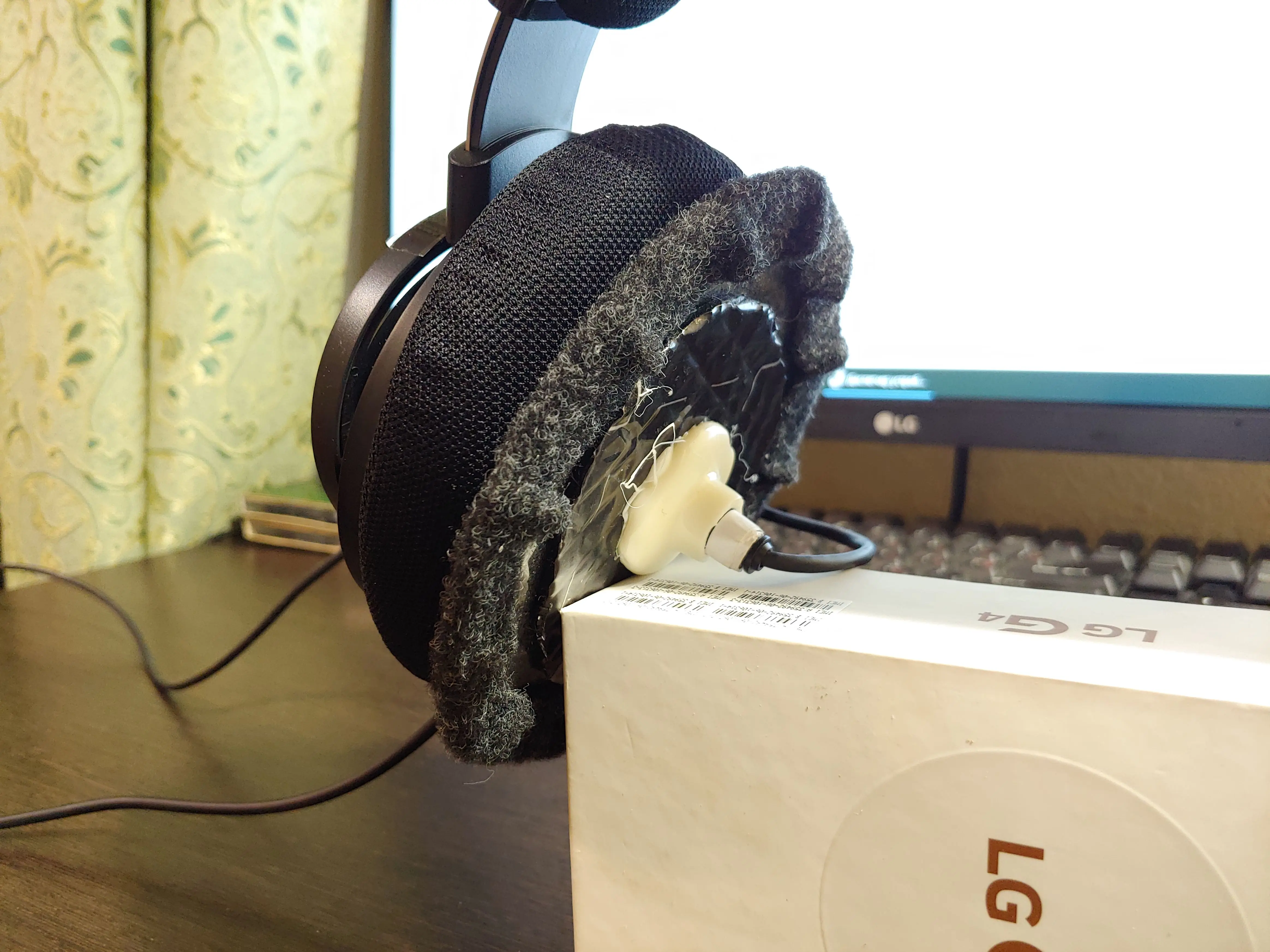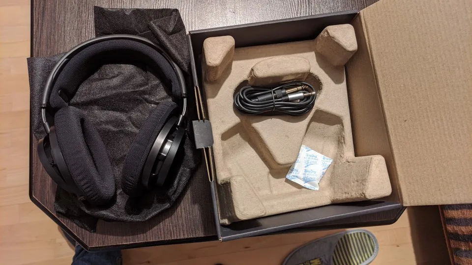 Коробка с наушниками была упакована ОЧЕНЬ хорошо. Несколько слоёв пупырчатой плёнки, всё обвязано скотчем. Коробка обложена пергаментом, чтобы скотч не повредил. Почтовый пакет так же был обмотан скотчем. Огромное спасибо продавцу за хорошую упаковку. Так же, в качестве подарка, к заказу был приложен держатель для телефона. Безделица, конечно, но приятно. Внешняя коробка - из мягкого картона. Сами наушники уложены во внутреннюю очень крепкую и плотную коробку, на выштампованный каркас из очень плотного картона. В комплекте - отсоединяемый трёхметровый кабель и переходник с 3,5 на 6,3, тканевый мешочек для хранения. Качество изготовления - хорошее. Все компоненты держатся довольно крепко. Ничего нигде не скрипит и не люфтит. Амбушюры - приятные, мягкие, тканевые. Мои уши охватывают полностью. На дуге есть регулировка с делениями. Продолжение дальше...