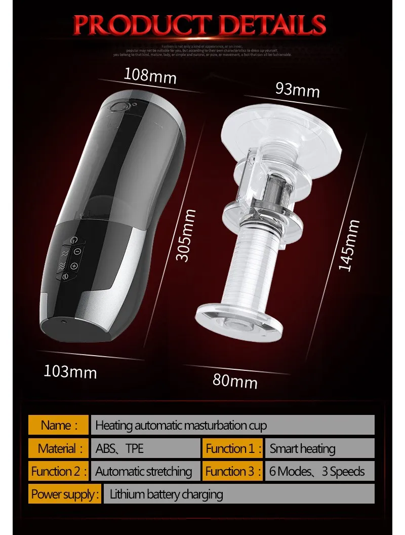 3 скорости, 6 режимов растяжки.Материал: термопластичный каучук, АБС-пластикРазмер: 305x108 x 103мм/12 ''x 4,21'' x 4,02''Питание: зарядка от вилкиВремя зарядки: около 2 чВремя использования: около 2,5 hВодонепроницаемый: 100% водонепроницаемыйШум: без звука