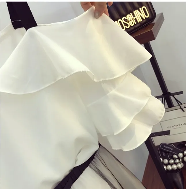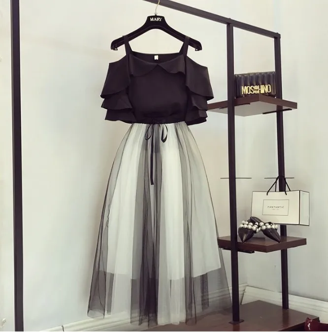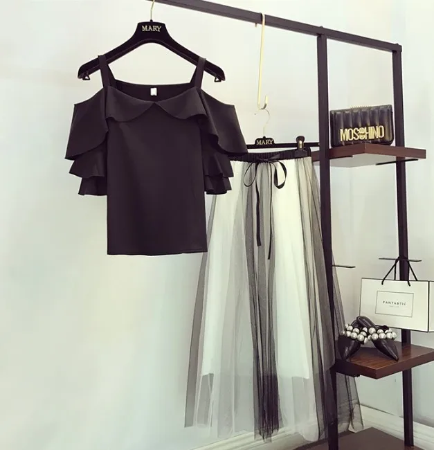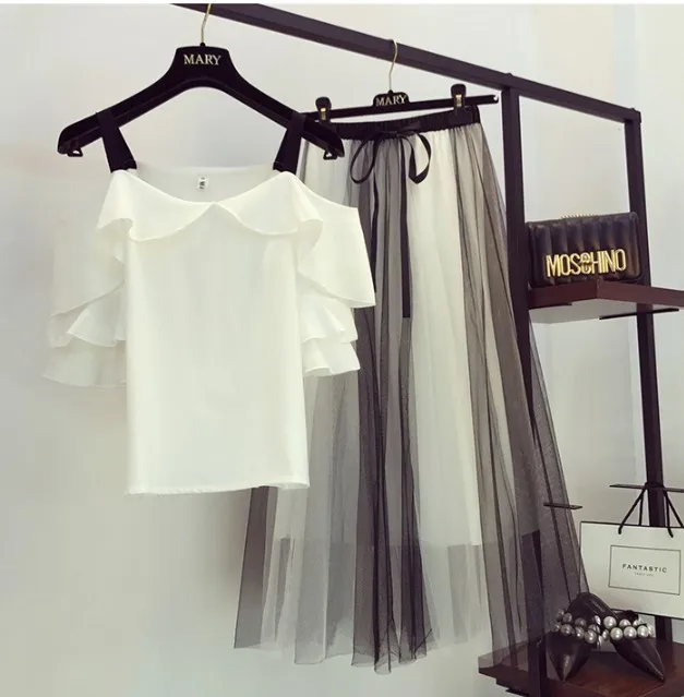 Женский комплект из двух предметов, простая шифоновая рубашка с открытыми плечами и цветная сетчатая юбка, длинная юбка для девочек-школьников, лето