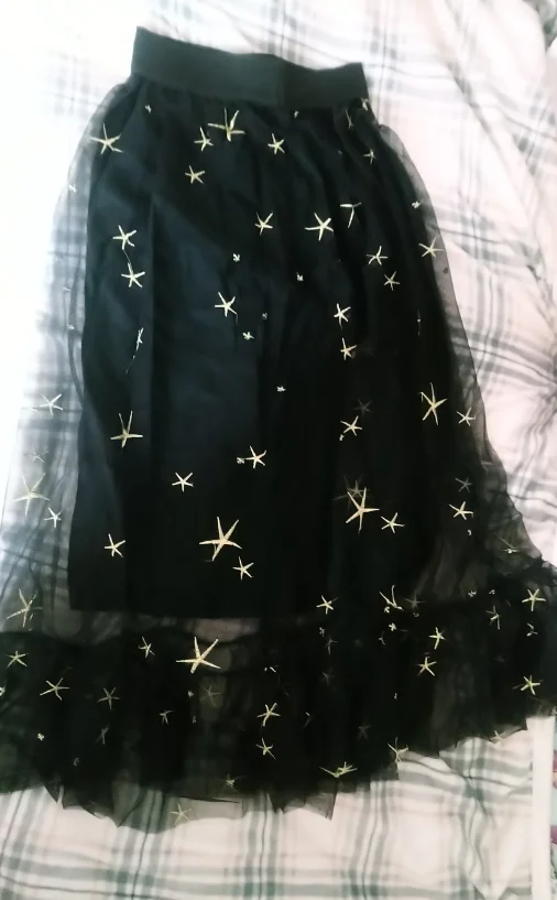 Прибыло в течение 2 недель. Очень красивая юбка в сеточку. Несколько рассыпчатых нитей со звездами, ничего плохого. Длина по щиколотку (я короткий, 153 см). Слегка проскальзывает под коленом, льстит для маленьких девочек. Хороший широкий пояс, хорошо растягивается. Я Размер 8 (Великобритания), но могу видеть, что он подходит до размера 12. Милый и цветочный.