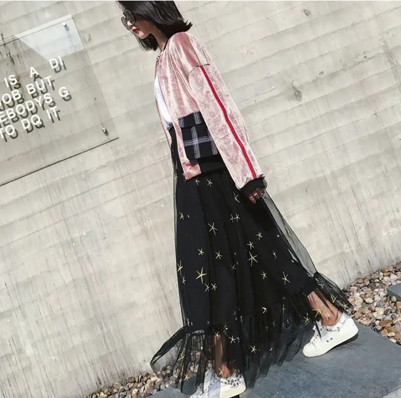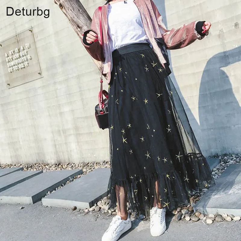 Женская длинная юбка с вышивкой в виде звезд, Повседневная плиссированная черная школьная юбка из тюля с высокой эластичной талией, Saias 2021, весна SK165