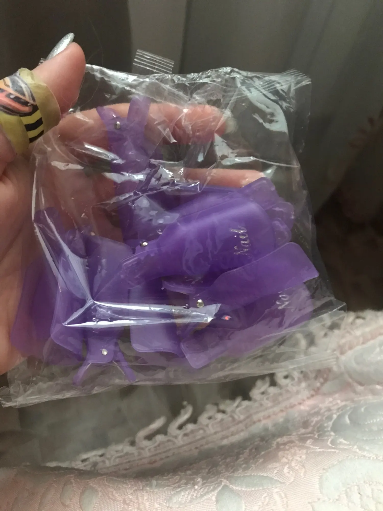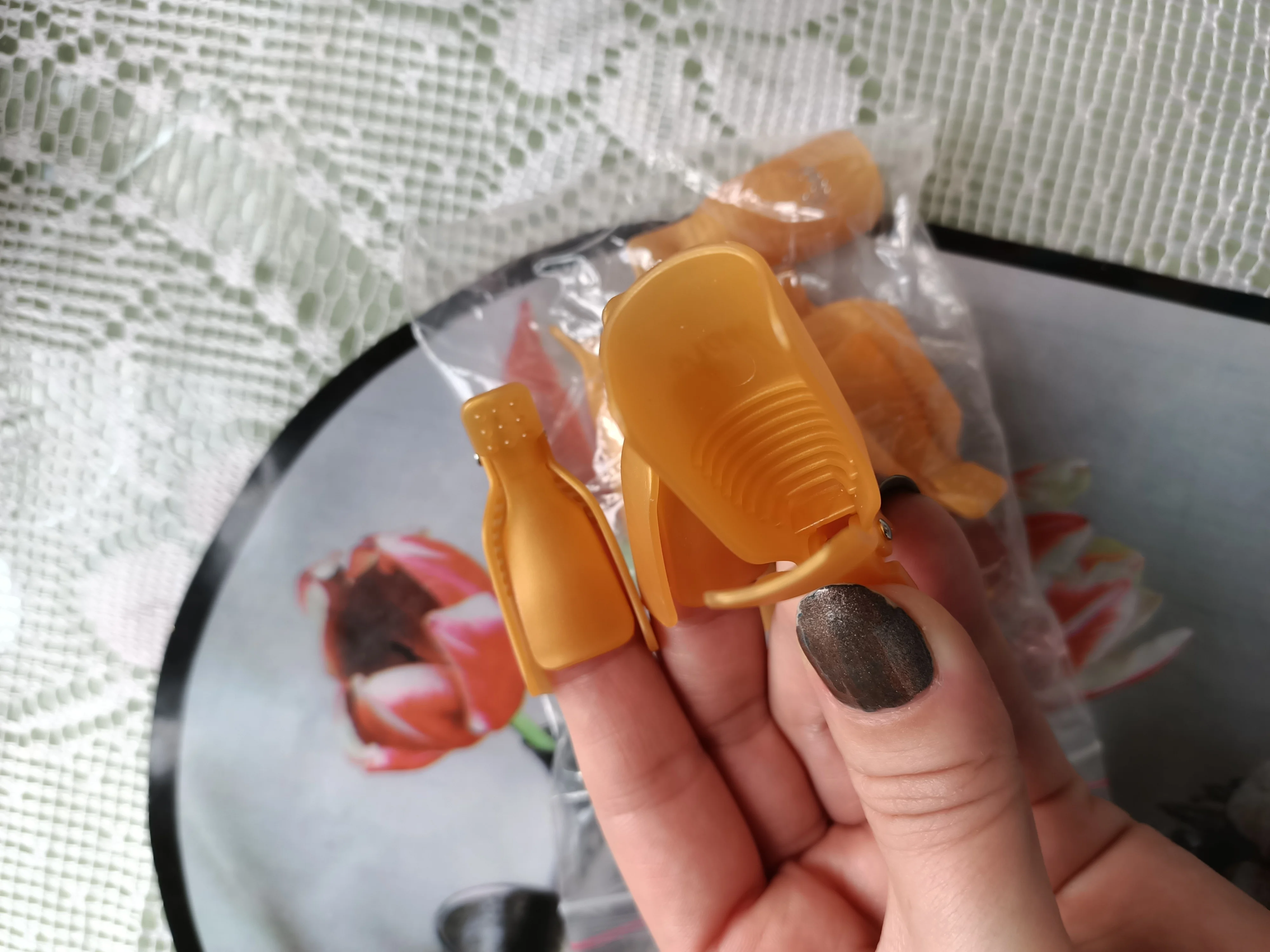 Доставка в Украину чуть меньше месяца. Заказывала 16 ноября, получила-10 декабря. Я взяла набор из 10 штук, колпачки шикарные, хорошо держатся на пальцах и не передавливают. Зажимы,как на прищепках. Отличный способ быстро снять лак, чтобы не мучаться с фольгой. Спасибо большое продавцу