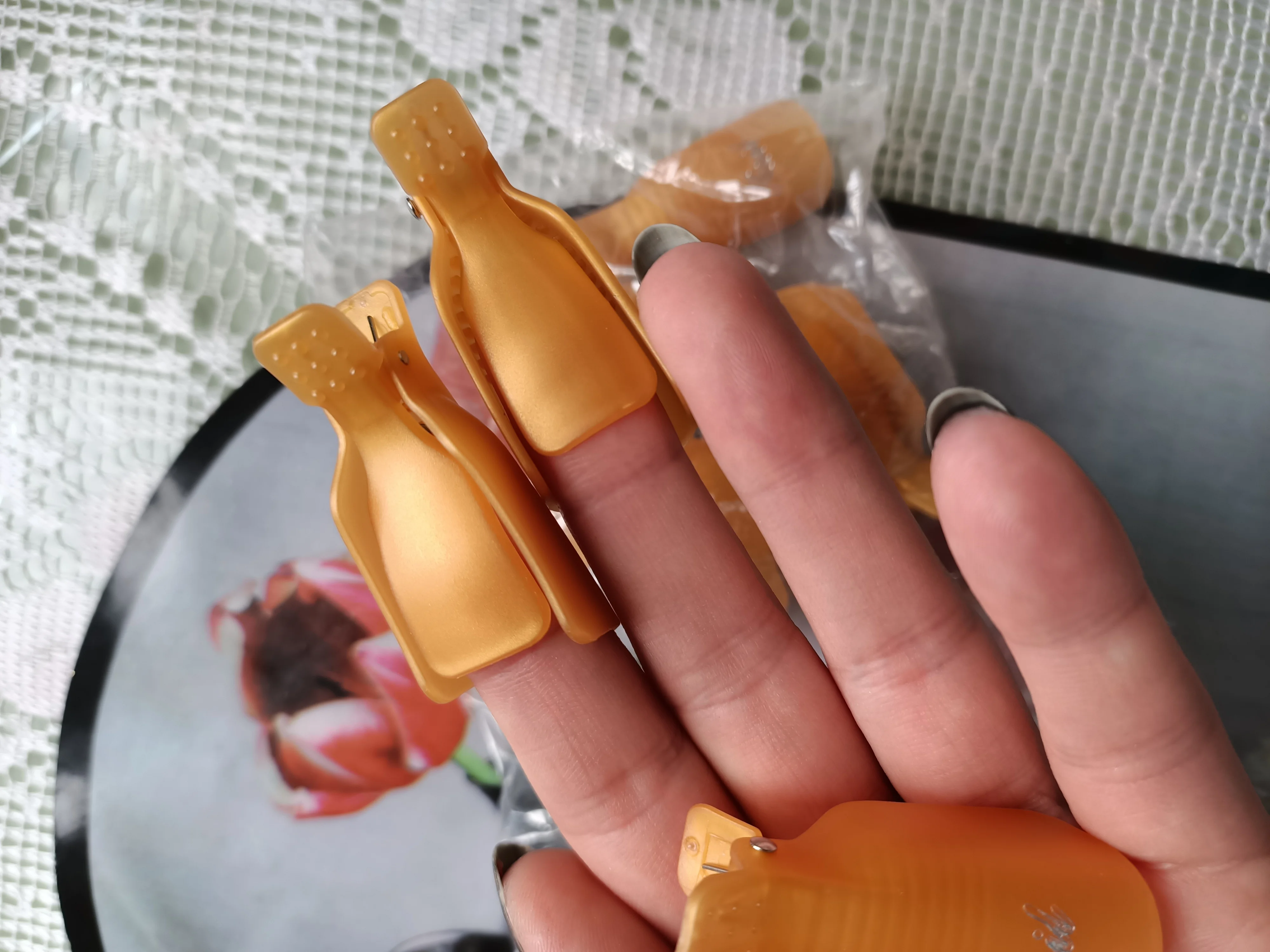 зажимы пришли в зип пакете. Еще не пробовала но вижу что качество хорошее. Держится на пальцах хорошо не падает на детских пальцах не спадают тоже. Продовца рекомендую.