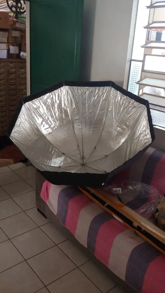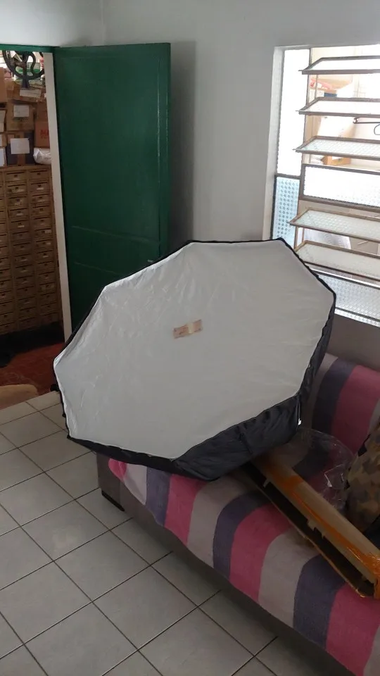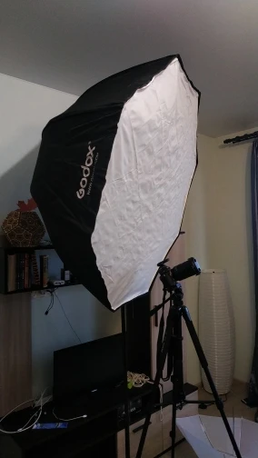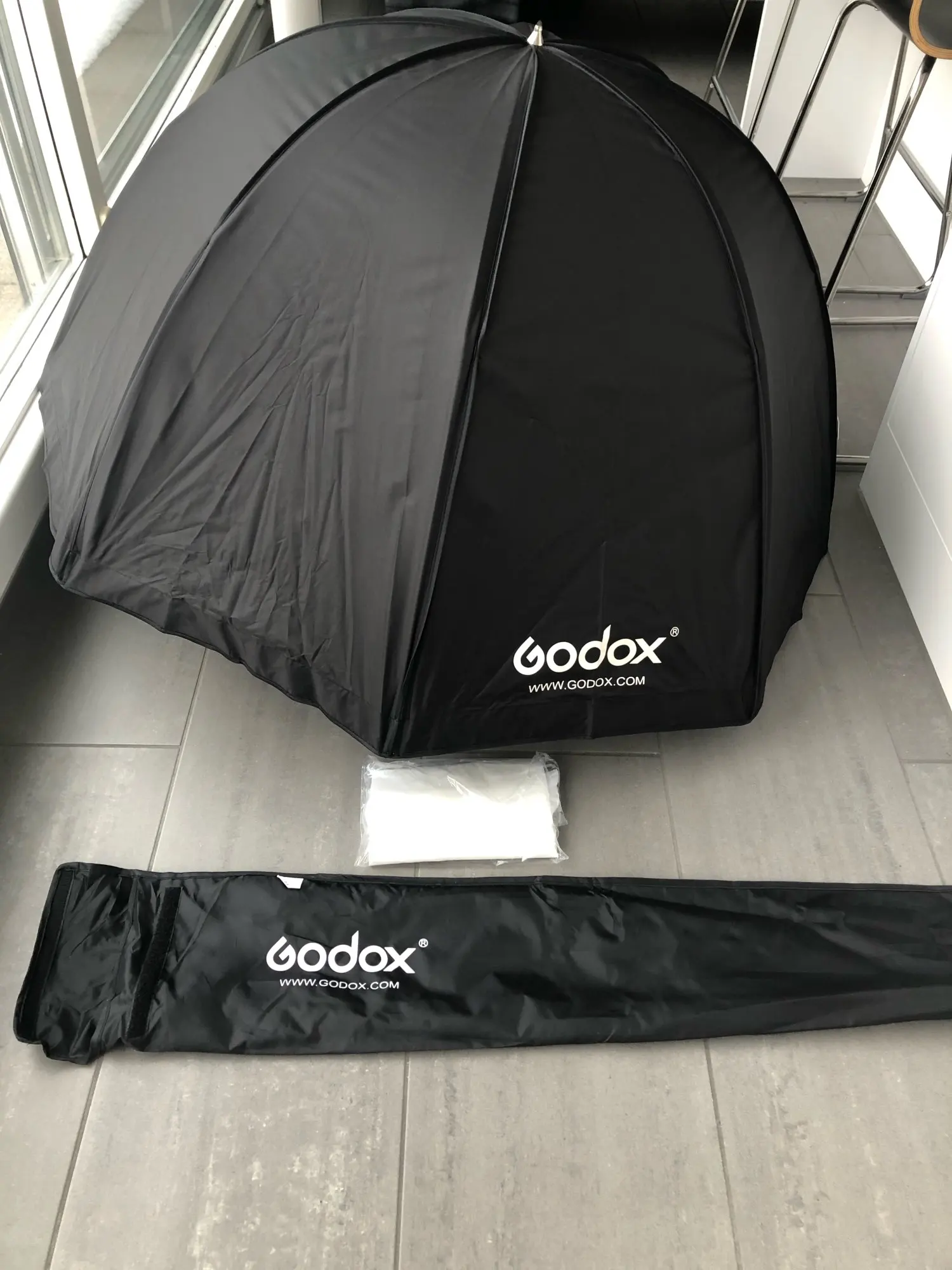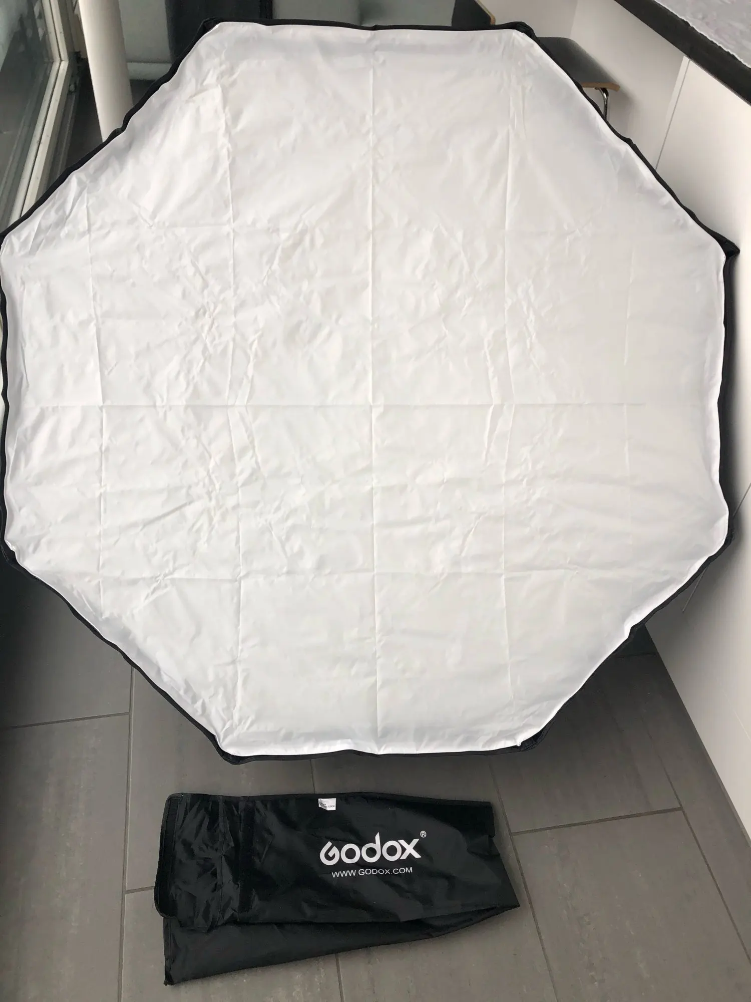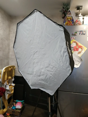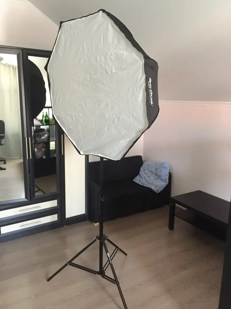 Огромный красавец, godox 685 заполняет его. Единственная проблема с тем, что наклонять его с обычной стойкой проблемно, приходится подгибать снизу. Лучше конечно на c-стенд его вешать.