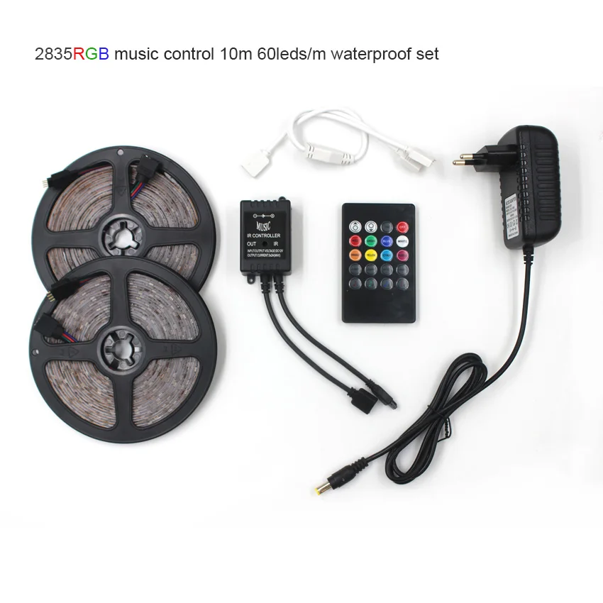 Цветная (RGB) Синхронизация музыки Светодиодные ленты светильник для Кухня SMD 5050 5 м Водонепроницаемый гибкая лента диод контроллер постоянного тока 12V адаптер переменного тока комплект противотуманных фар лампа