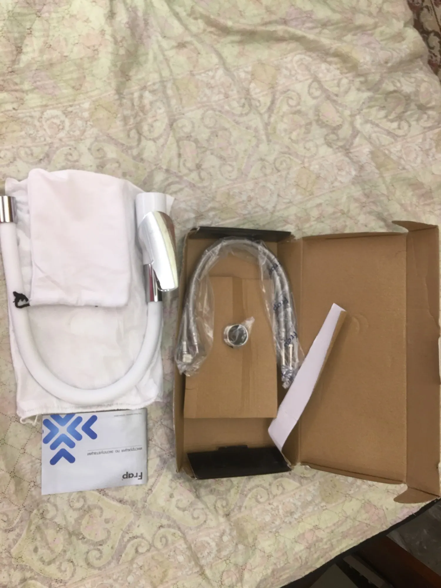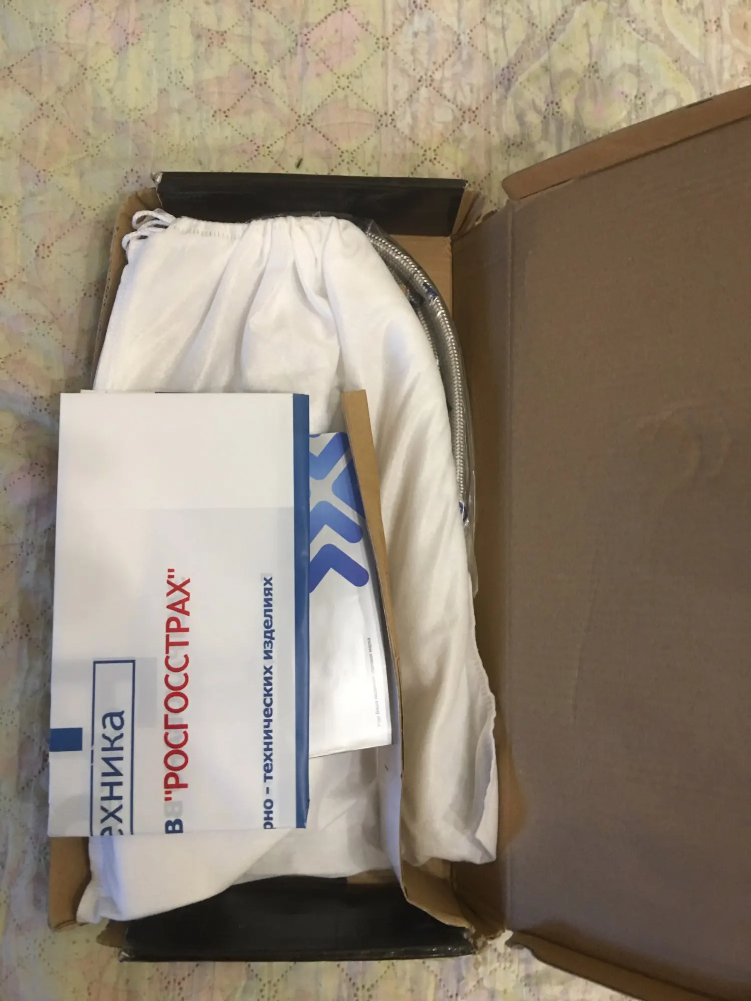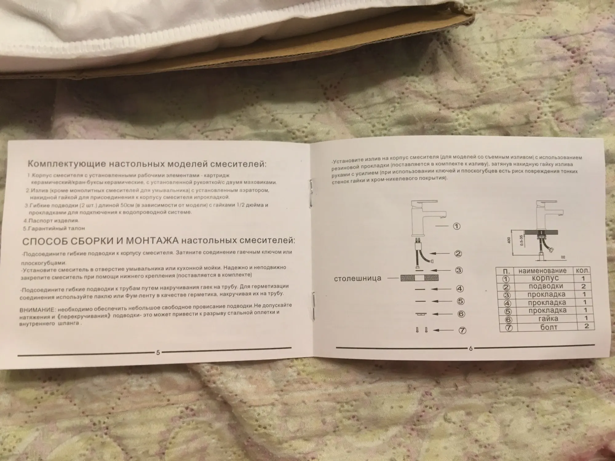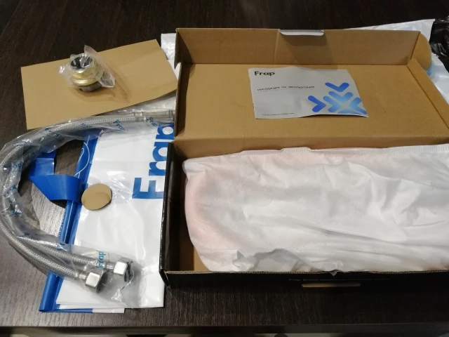 Выбрала «товар из России», Доставка чуть больше недели, курьер CDEK привёз до двери. Гарантия и инструкция на русском. Коробка слегка мятая из пересушенного картона. Сам смеситель в белоснежном мешочке со шнуровками, ещё мешочек по меньше одет на блок с рычажным краном персонально.