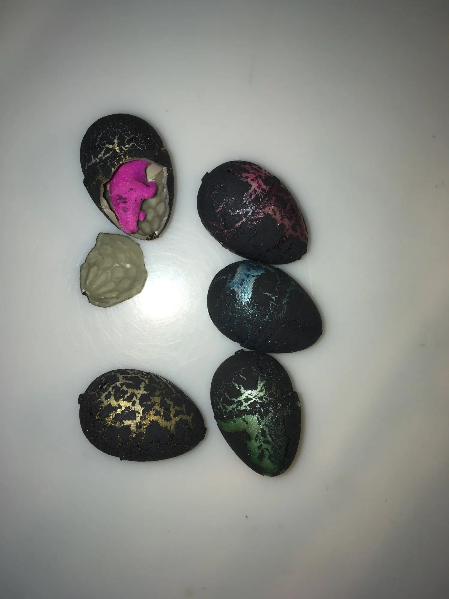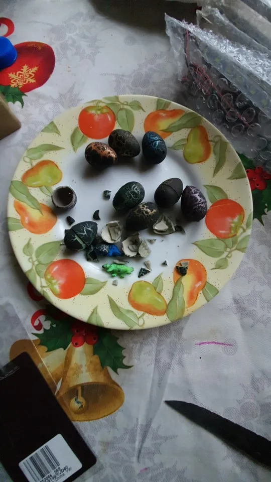 2 из 5 яиц приехали разбитые, хоть и в пакете с пупыркой. Внутри миниатюрные динозаврики разных цветов. Доставка в Украину около месяца