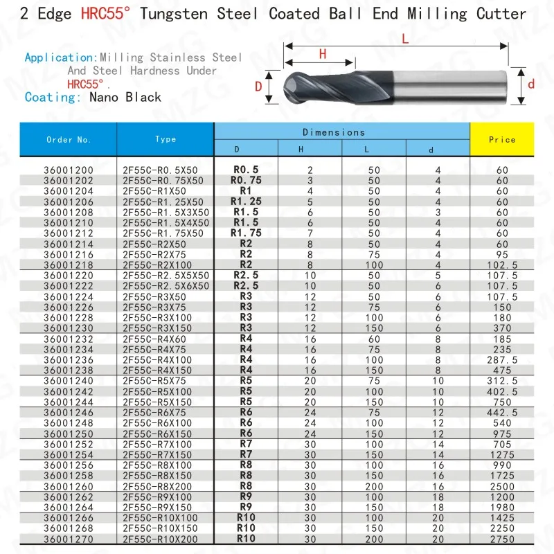 Концевая фреза MZG HRC55, фреза из вольфрамовой стали с 2 фрезами, 1 мм, 2 мм, 3 мм, 4 мм, 5 мм