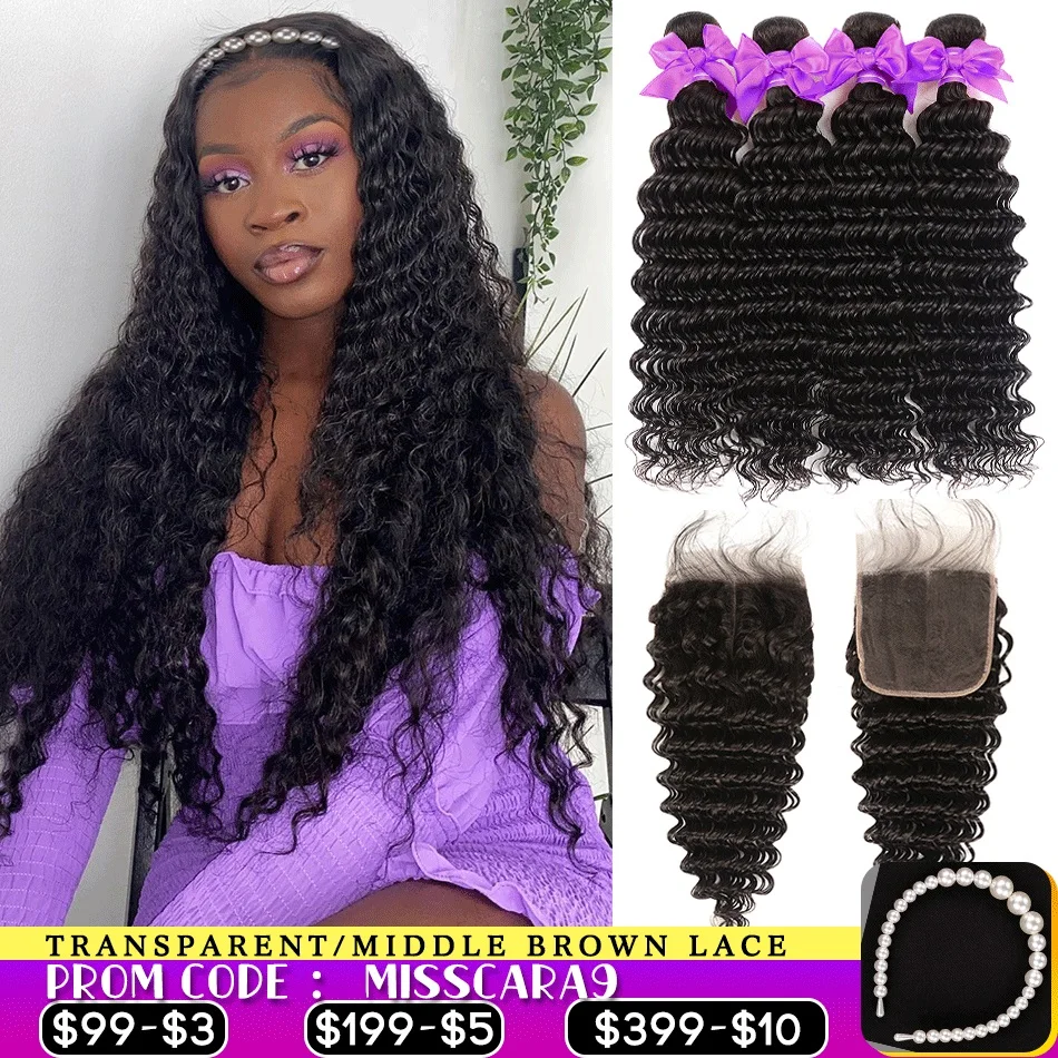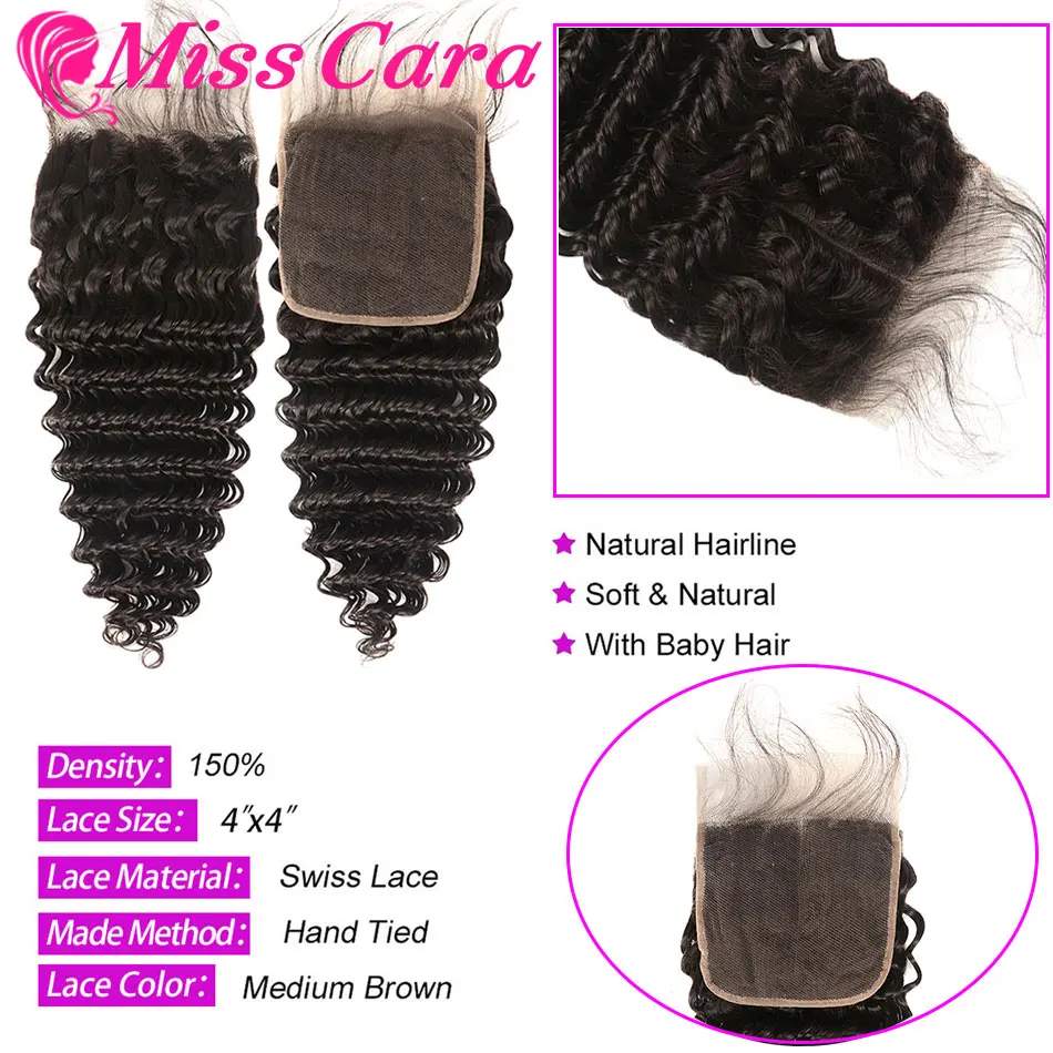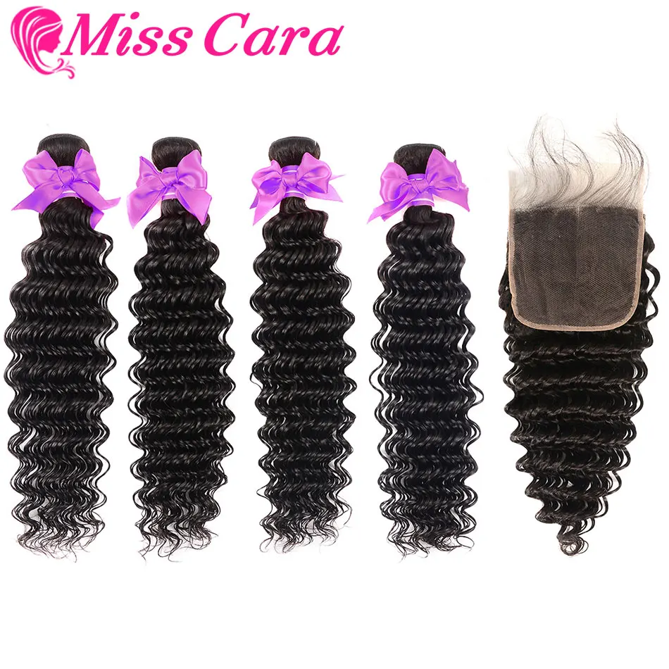 Глубокая волна пряди с закрытием Miss Cara перуанские волосы пряди с закрытием 10A человеческие девственные волосы 3/4 пряди с 4x4 закрытием