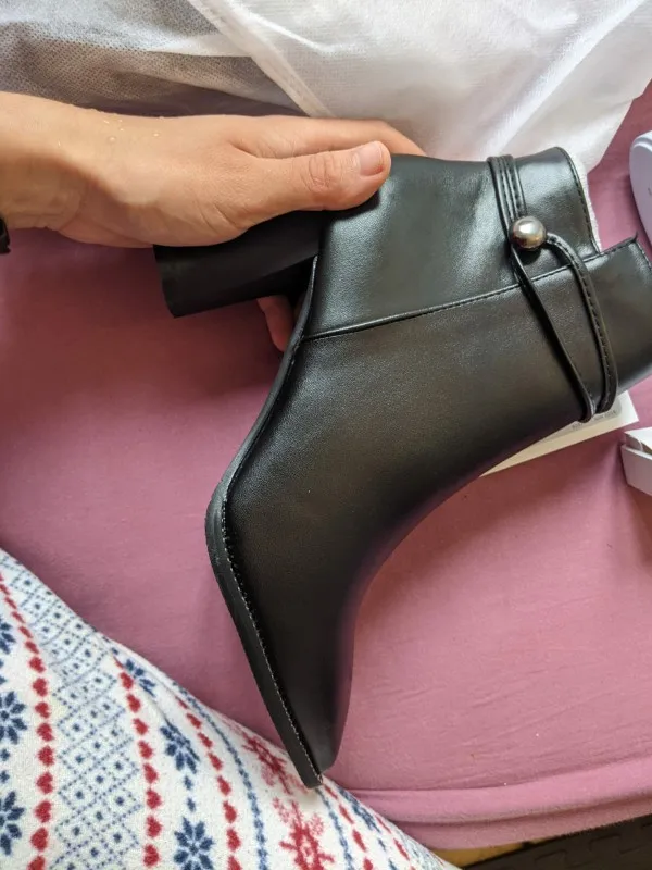 Заказ прибыл всего за 15 дней во Францию и в идеальном состоянии. Ботильоны поставляются хорошо защищенными индивидуально тканевыми карманами. Весь был упакован в карман, состоящий из воздушно-надутых трубок, и там была даже пузырчатая бумага. Внутри каждой обуви были даже кусочки полистирола, на уровне стопы и лодыжки, чтобы они сохраняли свои формы! Они идентичны описанию и фотографиям. Острый носок очень женственный. Они шикарные и стильные одновременно. Отделка очень хорошая (не плиссированная, не царапается). Маленькие ногти, выступающие в качестве украшения, все в наличии. Высота каблука 9,5 см. Для размера, я получил свой обычный размер. Но если у вас сильная/широкая стопа, выбирайте на размер больше. Они красивые! Я рисую их. .. Я рекомендую этого продавца.