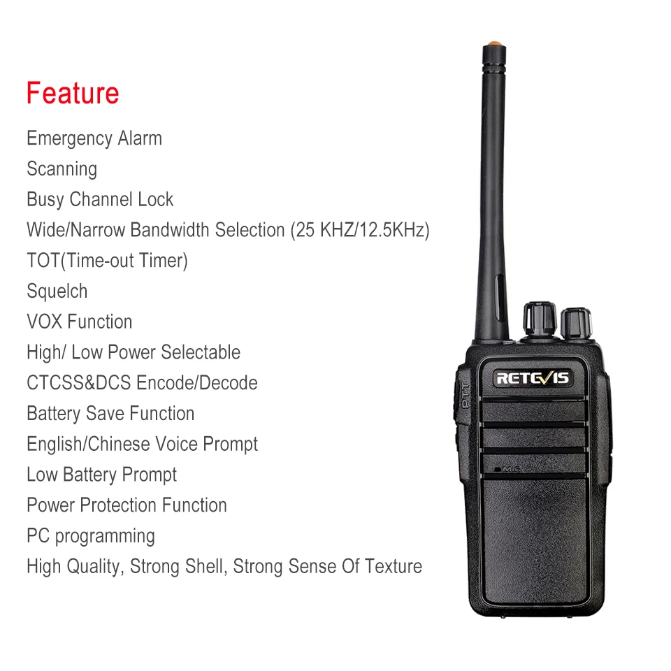 Аварийной сигнализацииСканированияБлокировка занятого каналаШирокий/Узкий выбор полосы пропускания (25 кГц/12,5 кГц)TOT (таймер таймаута)ШумоподавленияФункция VOXВысокая/низкая мощность на выборCTCSS и DCS кодирование/декодированиеФункция заряда батареиГолосовая Подсказка на английском/китайском языкеНизкий уровень заряда батареи подсказкиМощность функция защиты от перегрузкиPC программированиеВысокое качество, прочная оболочка, сильное чувство текстуры