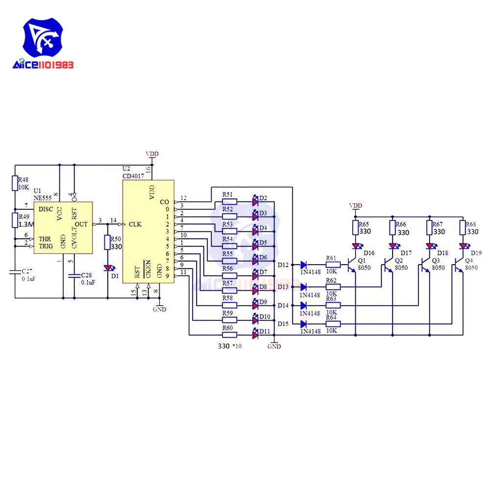 3. Схема лампы с потоком воды: CD4017, NE555 светодиодный, после правильной подключения она будет работать.