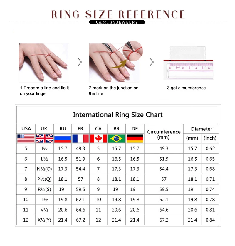 2. Размер кольцаНаши кольца используют стандартную таблицу размеров США. Просто используйте нашу таблицу размеров кольца, чтобы измерить ваш палец. Если кольцо, которое вы заказали, будет слишком большим или слишком маленьким, просто верните нам кольцо с подробным примечанием, и мы заменим его на правильный размер.