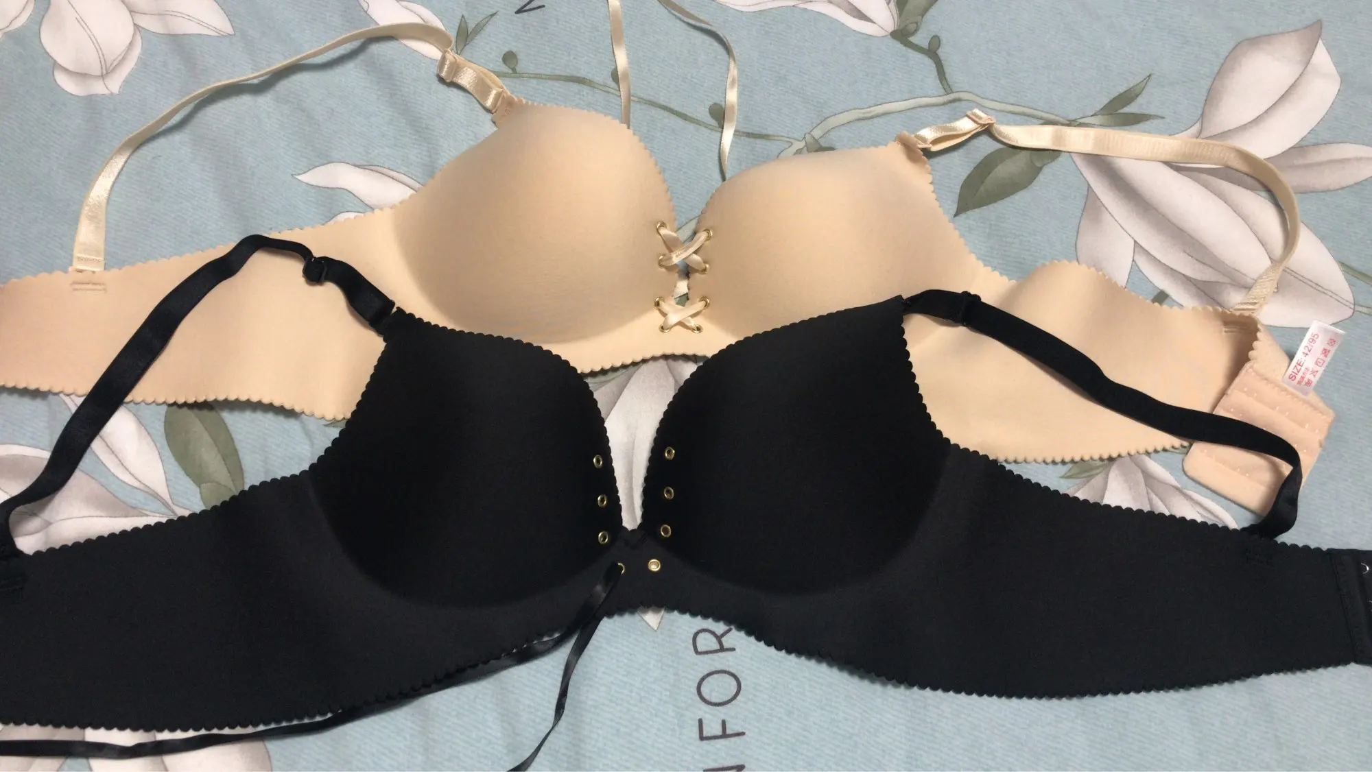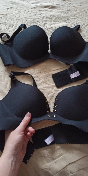 Бра хороший, аккуратный, материал очень плотный. Даже из моего первого размера делает что-то вполне похожее на объём. Но берите размер в размер, я обычно ношу 85, взяла 80, в итоге довольно сильно жмёт, но это можно исправить расширителями.