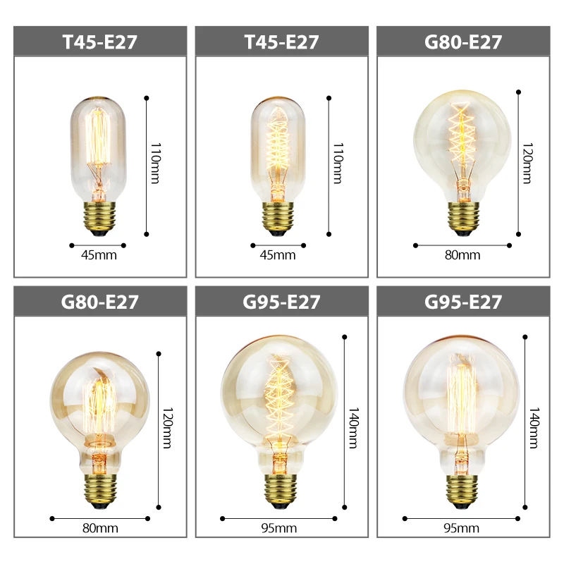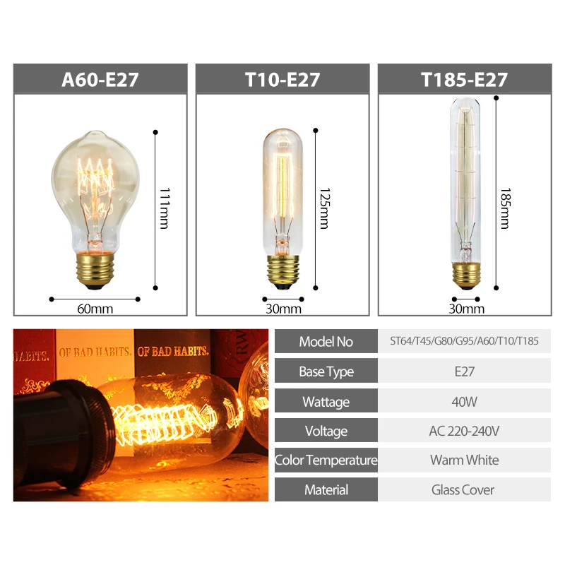 Винтажная лампа Эдисона в стиле ретро, лампа накаливания E27, G95, G80, A19, T10, T45, T185, 220 В, свадебное освещение, 40 Вт, для украшения дома