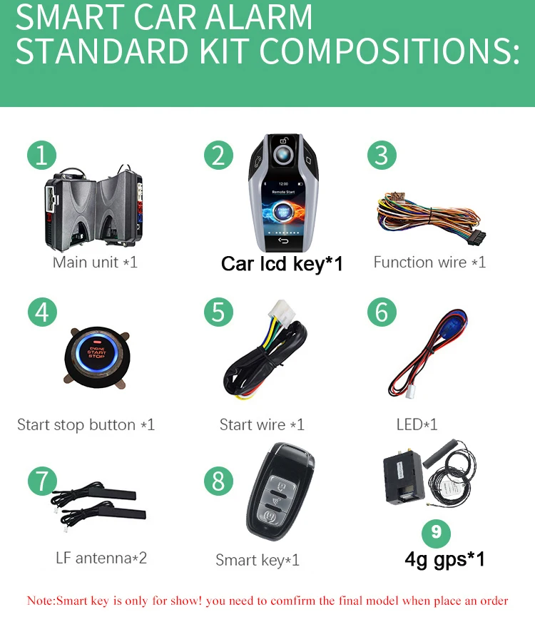 Основной блок-1 шт., стартовые кабели-1 шт., основные кабели-1 шт., умный ключ-2 шт., антенны-2 шт., кнопка запуска-1 шт.,1 шт. 4G GPS модуль, 1 шт. светодиодный светильник, 1 шт. цветная коробка.