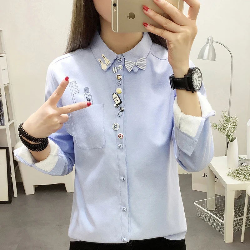 Осенне-зимняя Женская Полосатая милая блузка с вышивкой, Женская бархатная рубашка с длинными рукавами, теплые облегающие утепленные Топы